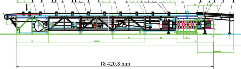 (8)整体更换4#运矸倒拉带式输送机驱动和储带仓部分,避免启动或运行时咬带和纠偏。改造后井下充填矸石储运带式输送机布置如图7所示,机头全长18.4 m,驱动布置在后方。