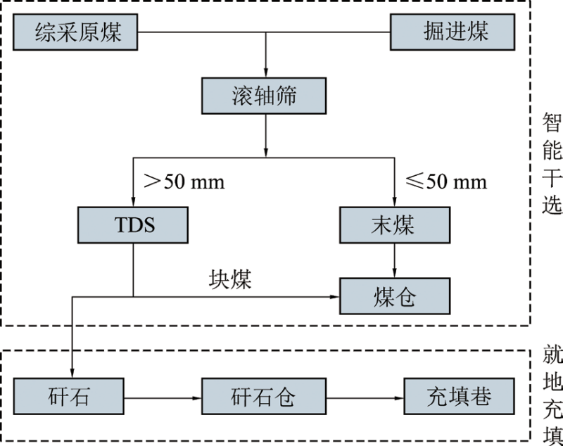 百良旭升煤矿于2021年8月完成采选充一体化充填项目的建设,实现了井下煤矸智能干选及就地充填。井下布置智能干选设备将原煤进行煤矸洗选,洗选出的精煤返回煤仓,洗选出的矸石填充至边角煤和建下压煤区域的充填巷中,探索出了经济效益和社会效益相结合的资源低损失、环境低损伤、经济高收益的矸石综合处理成套技术方案,建立了关中老矿区生态环境治理与高质量发展的新模式。井下采选充工艺流程如图1所示。