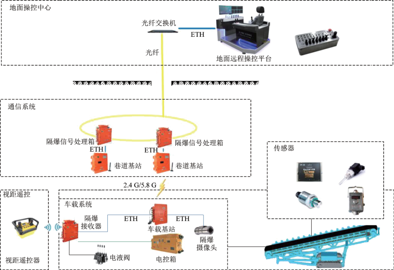 百良旭升煤矿井下抛矸机为基本型,不带遥控,根据实际情况,综合考虑实现远程控制、抛矸充填自动化、少人或无人化安全高效生产等因素,在不改变原有操作系统的基础上,增加本地视距遥控和地表集控中心远程视频遥控2种控制模式。电液改造的目的是实现远程控制,其地表远程控制系统由电液控系统、视频采集系统、数据采集系统、通信系统视距遥控系统和地表远程控制系统组成。