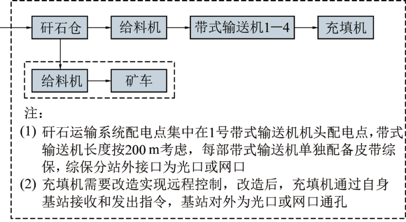 (1)井下充填矸石储运系统设备开关统一型号厂家,在1#带式输送机头配电点处安设1套集成控制PLC系统,配有以太网口,通过光缆上传至地面集控中心,实现各设备信息上传和预警、试验和控制功能。