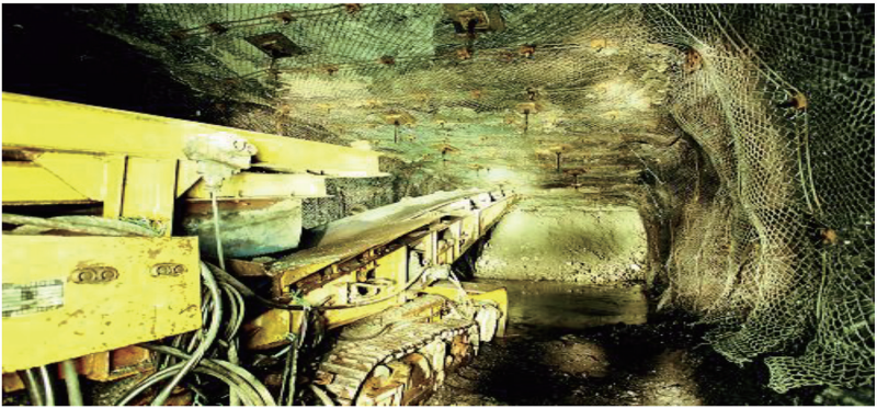 短壁干式充填(巷式充填)开采技术主要是针对我国部分煤矿井下掘进矸石或井下干选矸石产量大而研发的井下矸石置换煤柱技术,该技术以岩巷、煤-岩巷掘进过程中产生的矸石或者洗选矸石等材料作为充填物料,通过在工业广场煤柱、条带开采留设的煤柱、大巷保护煤柱、三角煤及“三下”压煤中布置充填巷,在充填巷道掘出后利用矸石充填输送机、高速动力抛矸机、无轨胶轮车、铲车等设备将矸石填充于充填巷内,从而达到充填置换煤炭资源、控制地表沉陷、处理矸石等废弃物、减少环境污染的目的。就地巷道矸石充填工艺流程及短壁干式充填现场如图3、图4所示。