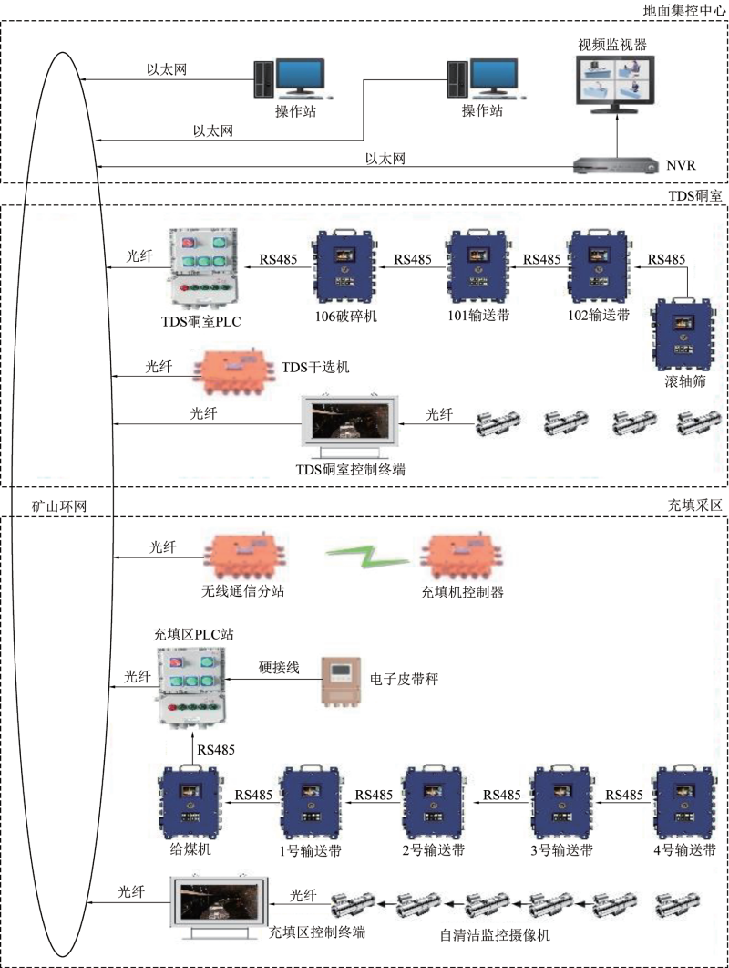 电控系统包含地面集控系统、TDS干选系统、TDS硐室分站、充填区分站、抛矸机控制系统。各子系统就近接入已建成的矿山环网,利用现有以太网进行通信和控制。采选充系统配置如图9所示。