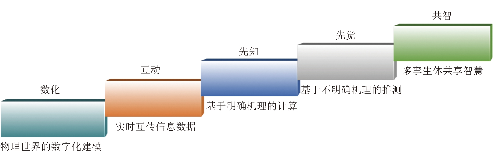 基于TGIS的数字孪生智能综采工作面不仅仅是物理智能综采工作面的数字镜像,也要接受物理世界的实时信息,更要将信息反馈给物理世界,而且进化为物理世界的先知、先决的超体。这个演变的过程称为成熟度进化,基于TGIS的数字孪生智能综采工作面生长发育将经历数化、互动、先知、先决和共智等几个过程,如图3所示。