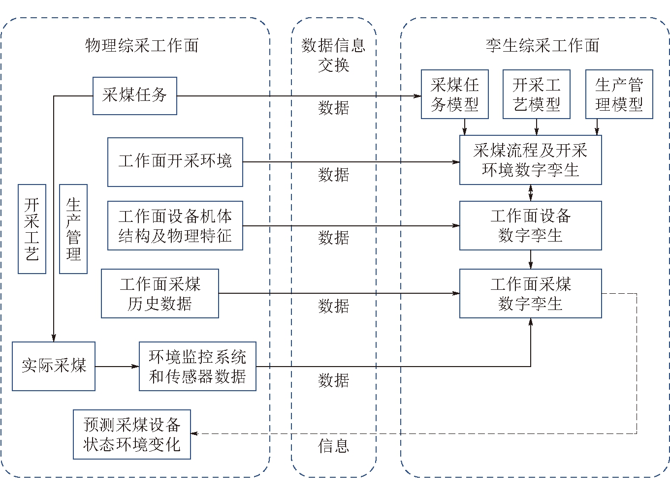 (2)通过传感器、控制单元等获取的物理综采工作面的设备实时运行数据和历史运维数据传输到孪生综采工作面并进行仿真优化;