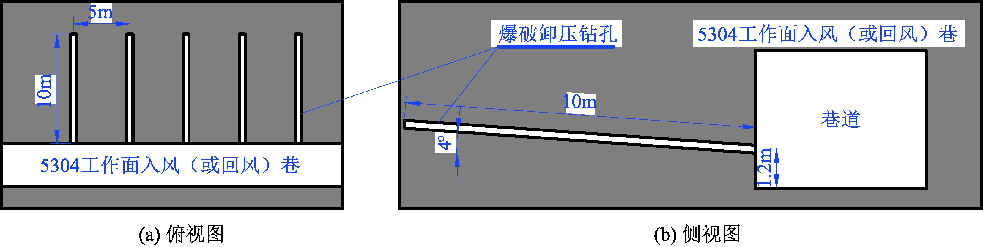 5304工作面回采过程中受构造、煤柱或采动影响,局部区域会出现冲击地压危险性。根据钻屑法预测的结果,当工作面出现冲击地压危险时,采用钻孔爆破进行卸压,如图3所示。