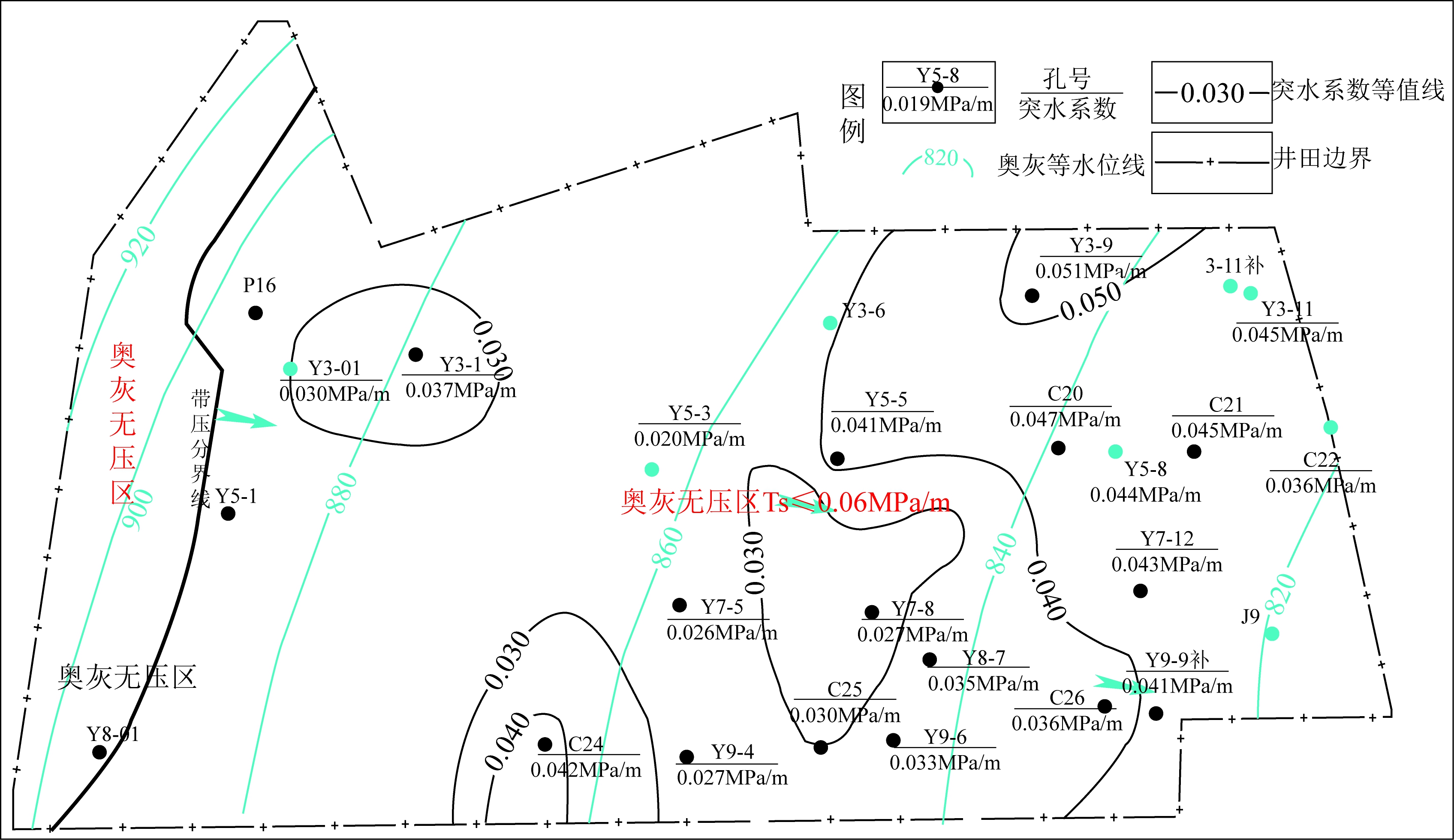 井田内发育巨厚的奥陶系灰岩含水层,为一区域含水层,具有统一的地下水位,根据抽水试验资料确定区内奥灰水位在+820~+920 m之间。下组9#煤层底板突水系数等值线图见图3。