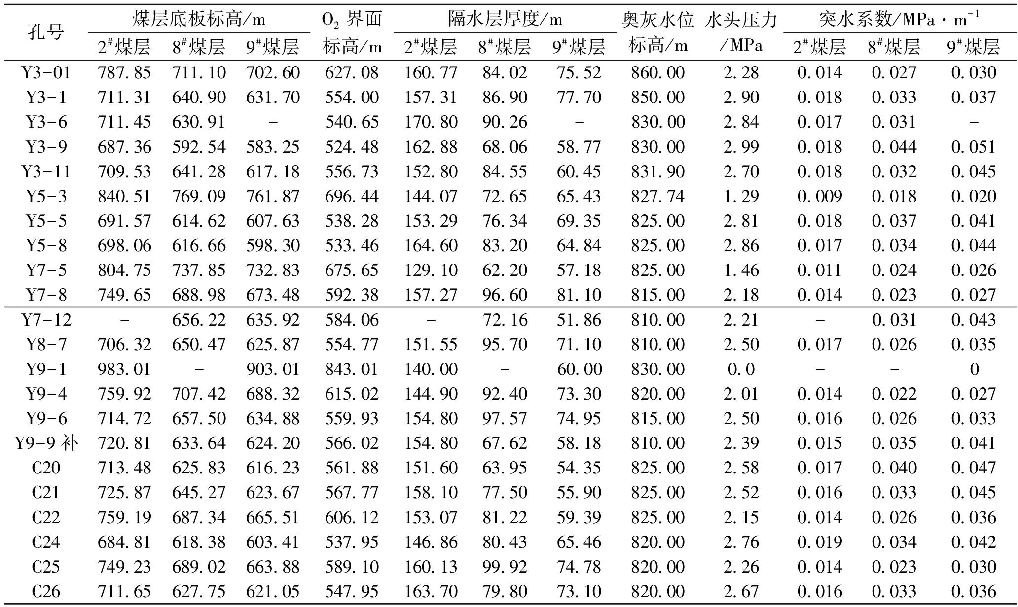 孔号煤层底板标高/m2#煤层8#煤层9#煤层O2界面标高/m隔水层厚度/m2#煤层8#煤层9#煤层奥灰水位标高/m水头压力/MPa突水系数/MPa·m-12#煤层8#煤层9#煤层Y3-0178785711107026062708160778402755286000228001400270030Y3-171131640906317055400157318690777085000290001800330037Y3-67114563091-54065170809026-8300028400170031-Y3-968736592545832552448162886806587783000299001800440051Y3-1170953641286171855673152808455604583190270001800320045Y5-384051769097618769644144077265654382774129000900180020Y5-569157614626076353828153297634693582500281001800370041Y5-869806616665983053346164608320648482500286001700340044Y7-580475737857328367565129106220571882500146001100240026Y7-874965688986734859238157279660811081500218001400230027Y7-12-656226359258406-7216518681000221-00310043Y8-770632650476258755477151559570711081000250001700260035Y9-198301-903018430114000-60008300000--0Y9-475992707426883261502144909240733082000201001400220027Y9-671472657506348855993154809757749581500250001600260033Y9-9补72081633646242056602154806762581881000239001500350041C2071348625836162356188151606395543582500258001700400047C2172587645276236756777158107750559082500252001600330045C2275919687346655160612153078122593982500215001400260036C2468481618386034153795146868043654682000276001900340042C2574923689026638858910160139992747882000226001400230030C2671165627756210554795163707980731082000267001600330036