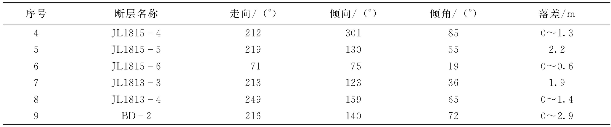 序号断层名称走向/(°)倾向/(°)倾角/(°)落差/m1JL18151240149400~1.22JL18152236145350~1.13JL18153248338750~1.0