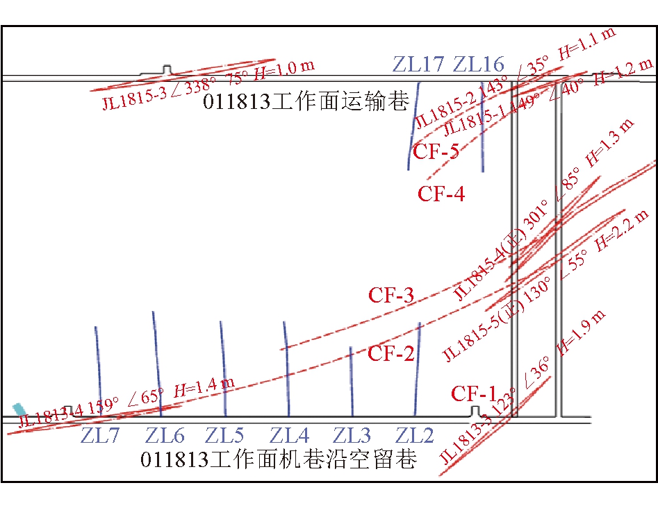 钻孔轨迹结合自然伽马测井结果分析,依次对ZL2-ZL7及ZL16-ZL17钻孔不同钻进深度时的地层岩性特征进行解释,精细确定槽波推断断层CF-2(JL1813-4)、CF-4(JL1815-1)、CF-5(JL1815-2)在工作面内部的延展方向和落差,最终成果如图14所示。