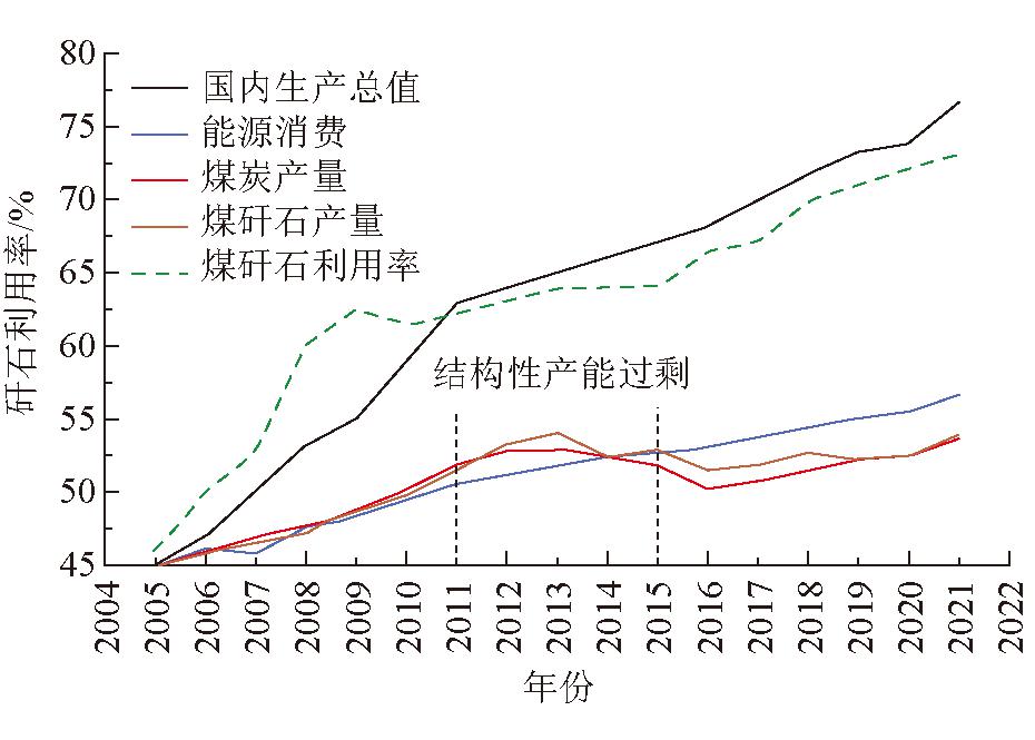 我国煤矸石产量与日俱增,2021 年矸石产量约为 7.43 亿t,比2020年增长了 5.84%。据预测,到 2025 年,煤矸石产量将达到 8 亿 t左右[11]。我国经济增长仍未与能源消耗及煤炭脱钩,煤矸石产量短期内预期不会显著下降,煤矸石充填处置已由2005年1亿t上升至2020年2.9亿t,且近年来仍呈上升趋势;2005-2011年,矸石发电快速发展,但近年来受发电行业状况及选煤技术进步的影响,消纳量较为稳定,消纳量约1.5亿t/a;制砖总体而言消纳量和潜力有限。未来一段时期内,提升煤矸石综合利用率的潜在手段主要集中在充填处置领域。我国经济发展及煤矸石利用状况如图 2所示。