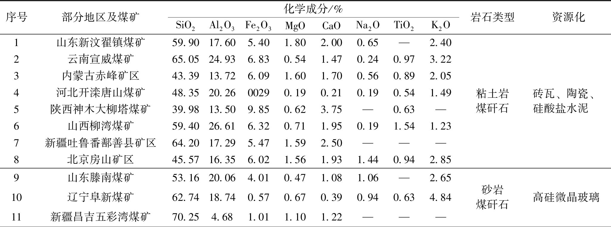 序号部分地区及煤矿化学成分/%SiO2Al2O3Fe2O3MgOCaONa2OTiO2K2O岩石类型资源化1山东新汶翟镇煤矿59.9017.605.401.802.000.65—2.402云南宣威煤矿65.0524.936.830.541.470.240.973.223内蒙古赤峰矿区43.3913.726.091.601.700.560.892.054河北开滦唐山煤矿48.3520.2600290.190.210.190.541.495陕西神木大柳塔煤矿39.9813.509.850.623.75—0.63—6山西柳湾煤矿59.4026.616.320.711.950.191.541.237新疆吐鲁番鄯善县矿区64.2017.295.471.592.50———8北京房山矿区45.5716.356.021.561.931.440.942.85粘土岩煤矸石砖瓦、陶瓷、硅酸盐水泥9山东滕南煤矿53.1620.064.010.471.081.06—2.6510辽宁阜新煤矿62.7418.740.570.670.390.940.634.8411新疆昌吉五彩湾煤矿70.254.681.011.101.22———砂岩煤矸石高硅微晶玻璃