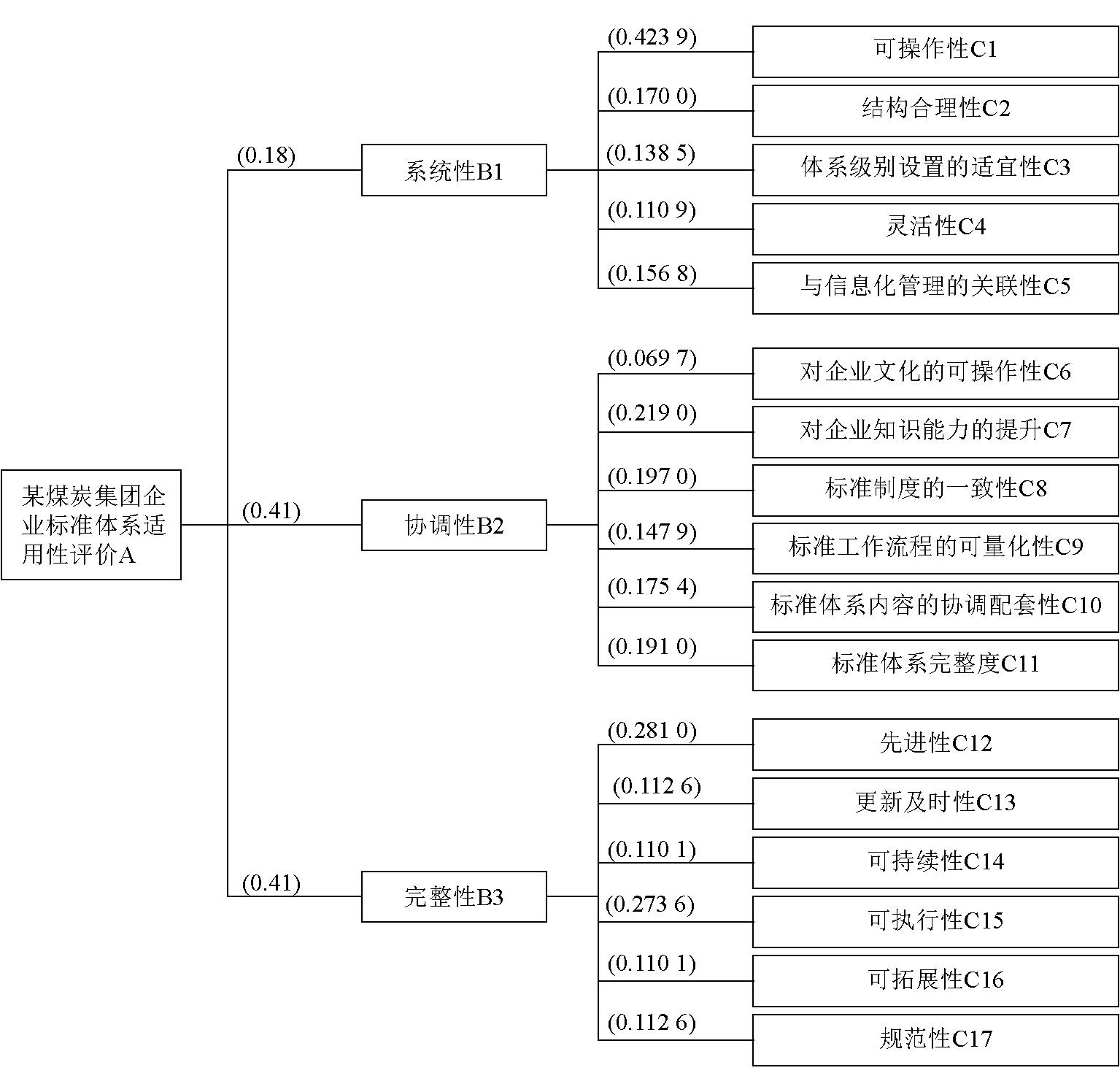 借鉴倪晓春的研究[8],从系统性、协调性和完整性3个准则层构建了包含17个指标的煤炭企业标准体系适用性评价体系,见表1。