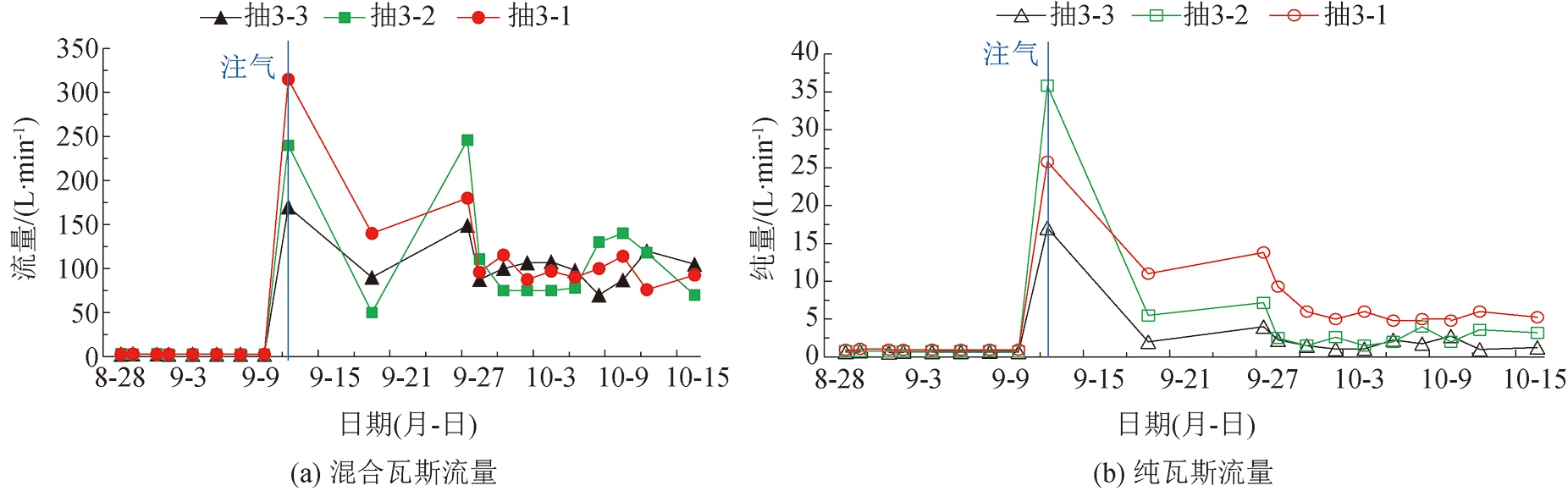 从图5可以看出,注气试验开始后(初始注气压力为2.5 MPa),抽2-1、抽2-2号孔混合流量和瓦斯纯量均有显著提升,一旦停止注气,流量便开始下降;第4次注气(2018年8月25日到9月4日,注气压力由2.5 MPa上调到4 MPa)期间,随着注气压力逐渐增大,混合流量呈现出正比例增大的趋势,说明混合流量的增长幅度与注气压力呈正比关系。