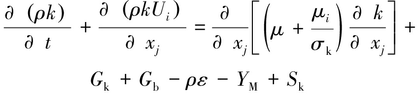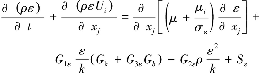 在各种湍流模型中,以K-ε模型最为典型,应用最为广泛,同时,低浓度瓦斯脉动燃烧器的进气可以视为各向同性的均匀湍流,因此选用精度较高且稳定的K-ε模型,控制方程如下: