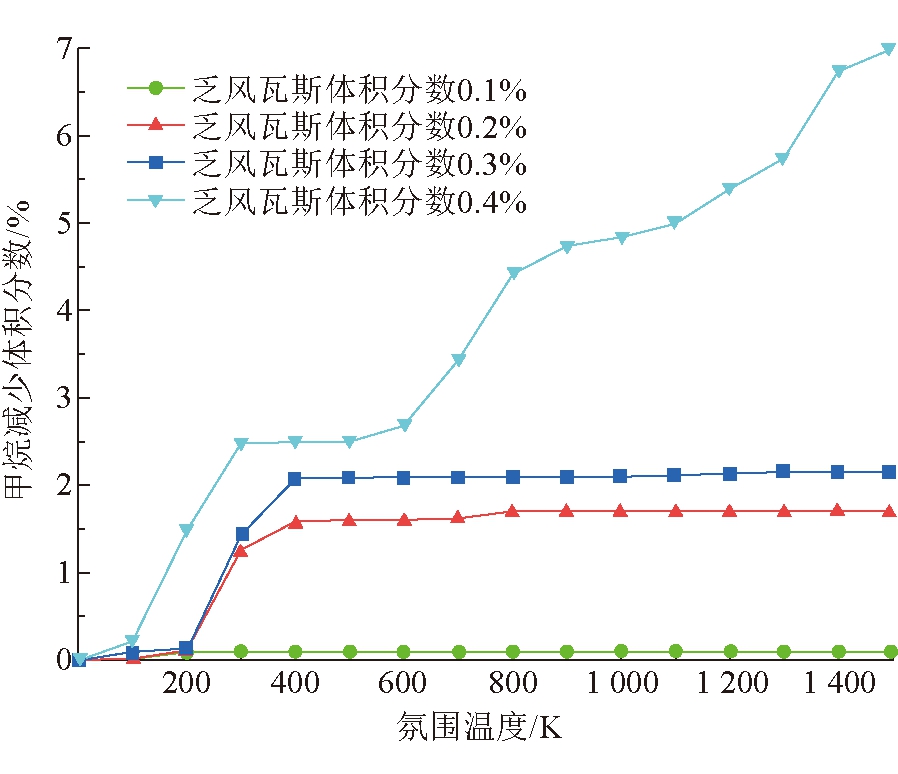 由图4可以看出,当乏风瓦斯体积分数小于0.1%时,燃烧器内不会发生燃烧反应;当乏风瓦斯体积分数大于0.4%,燃烧器内氛围温度达到200 K时,燃烧器内瓦斯体积分数减少量增加。
