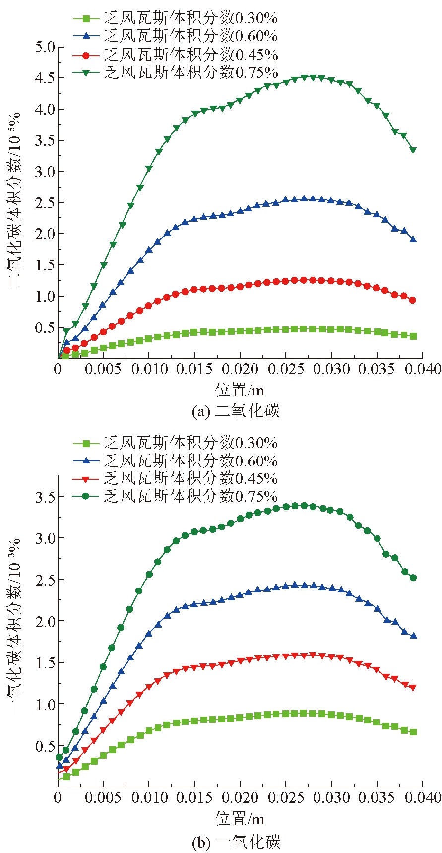 由图7可以看出,矿井乏风进入燃烧器后,一部分甲烷会首先经过分解而生成CH3、CH2和CH等多种碳氢化合物,这些多种类碳氢化合物沿着对称轴方向向前扩散,并在燃烧器内发生大量的燃烧反应,生成少量二氧化碳和少量的一氧化碳;当燃烧器入口乏风瓦斯体积分数为0.30%时,燃烧器对称轴线上二氧化碳生成量的体积分数小于4×10-6%,一氧化碳生成量的体积分数小于9×10-4%;随着燃烧器内乏风体积分数提高,燃烧器内具有的氧化性气氛较强,燃烧器对称轴线上不同位置二氧化碳和一氧化碳生成量也在增高,当燃烧器入口乏风瓦斯体积分数提高至0.75%时,对称轴线上的二氧化碳体积分数生成量增加867.61%,一氧化碳体积分数生成量增加283.02%。