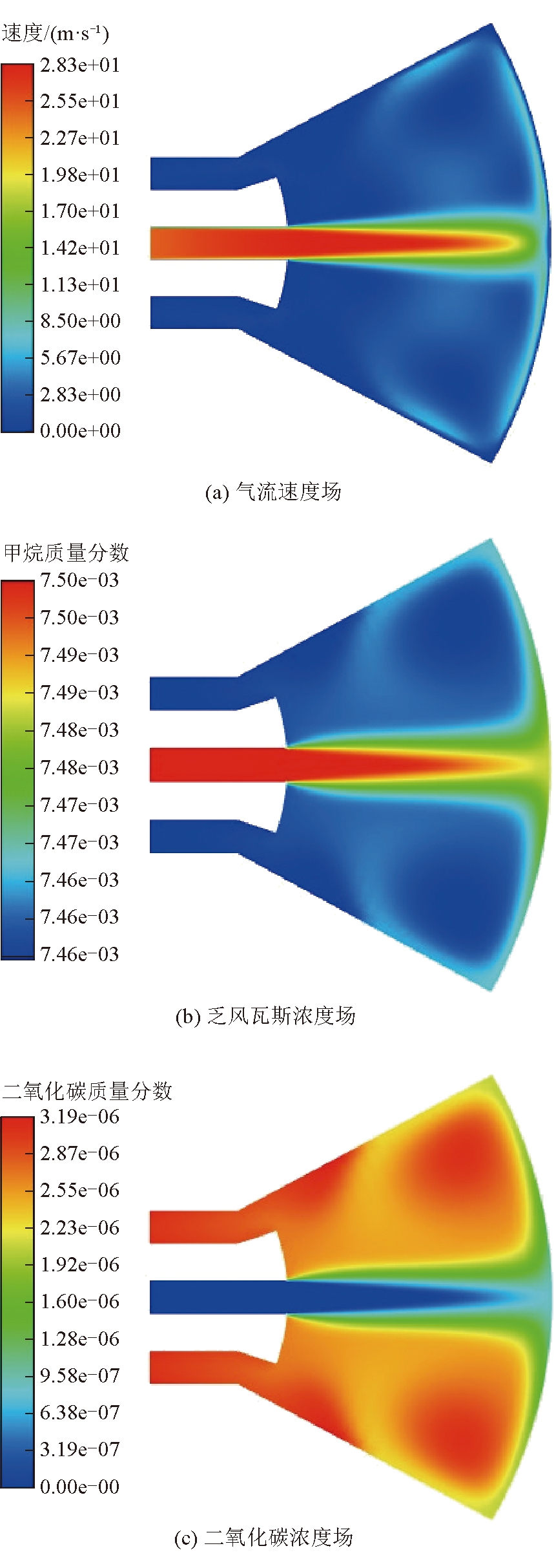 由图3可以看出,矿井乏风沿着中心轴线方向射入热氛围后,由于遇热在燃烧器中心轴线方向发生多点自燃现象,瓦斯浓度降低2.67%;随着火焰迅速向轴线方向扩散,逐渐形成稳定的轴向火焰;同时,在回流区生成了少量二氧化碳,在燃烧器出口处二氧化碳浓度达到了0.031 9%。