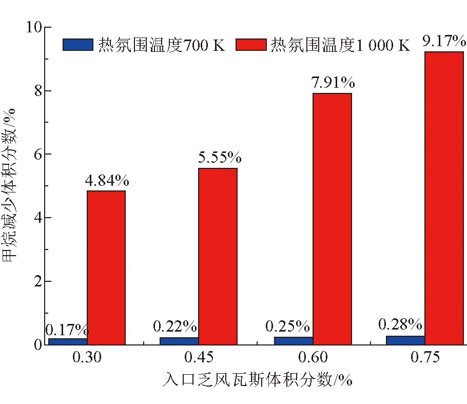 为了分析乏风瓦斯体积分数对燃烧器内燃烧特性的影响,分别研究乏风瓦斯体积分数为0.30%、0.45%、0.60%和0.75%时,燃烧器热氛围温度为700 K和1 000 K时燃烧器内乏风甲烷减少情况和燃烧器内温度上升情况,如图5和图6所示。