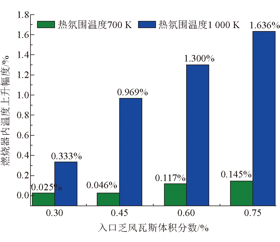 由图5和图6可以看出,当燃烧器的热氛围温度为700 K时,燃烧器内不能形成稳定的燃烧火焰,当入口乏风瓦斯体积分数为0.30%时,燃烧器内甲烷减少体积分数为0.17%,而随着燃烧器内氛围温度上升到1 000 K时,甲烷减少体积分数为4.84%,当随着入口乏风瓦斯体积分数提高到0.75%时,甲烷减少体积分数提高到9.17%;当燃烧器的热氛围温度为700 K时,由于甲烷体积分数较低,燃烧器内出现低温氧化情况,温度上升幅度在0.020%~0.145%;随着燃烧器内氛围温度上升到1 000 K时,气相燃烧发热量增加,燃烧器内温度增加,温度上升幅度在0.333%~1.636%。