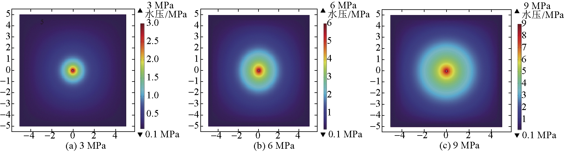 不同注水压力水压分布云图见图2。由图2可以看出,在注水压力相同的条件下,距离钻孔中心距离越远,区域水压值越小,减小量呈现以钻孔为中心向四周均匀分布;随着注水压力增大,水的湿润范围越广,以钻孔为中心高水压区域范围越广。