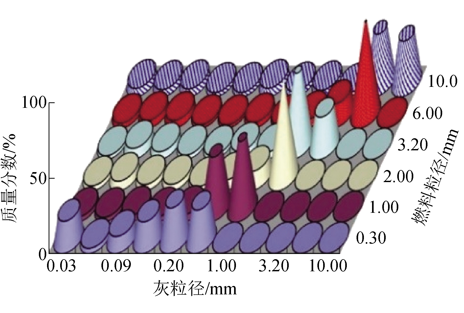 燃料在CFB锅炉炉膛内的燃烧以及颗粒之间的不断碰撞会形成不同粒径的颗粒,虽然煤矸石和煤泥等低热值燃料的特性与一般的原煤差别较大,但仍可以采用煤的本征成灰特性进行研究,根据燃料的本征成灰特性研究方法[28],获得了某典型低热值煤矸石生成的不同粒径颗粒的比例,矸石本征成灰特性如图6所示。