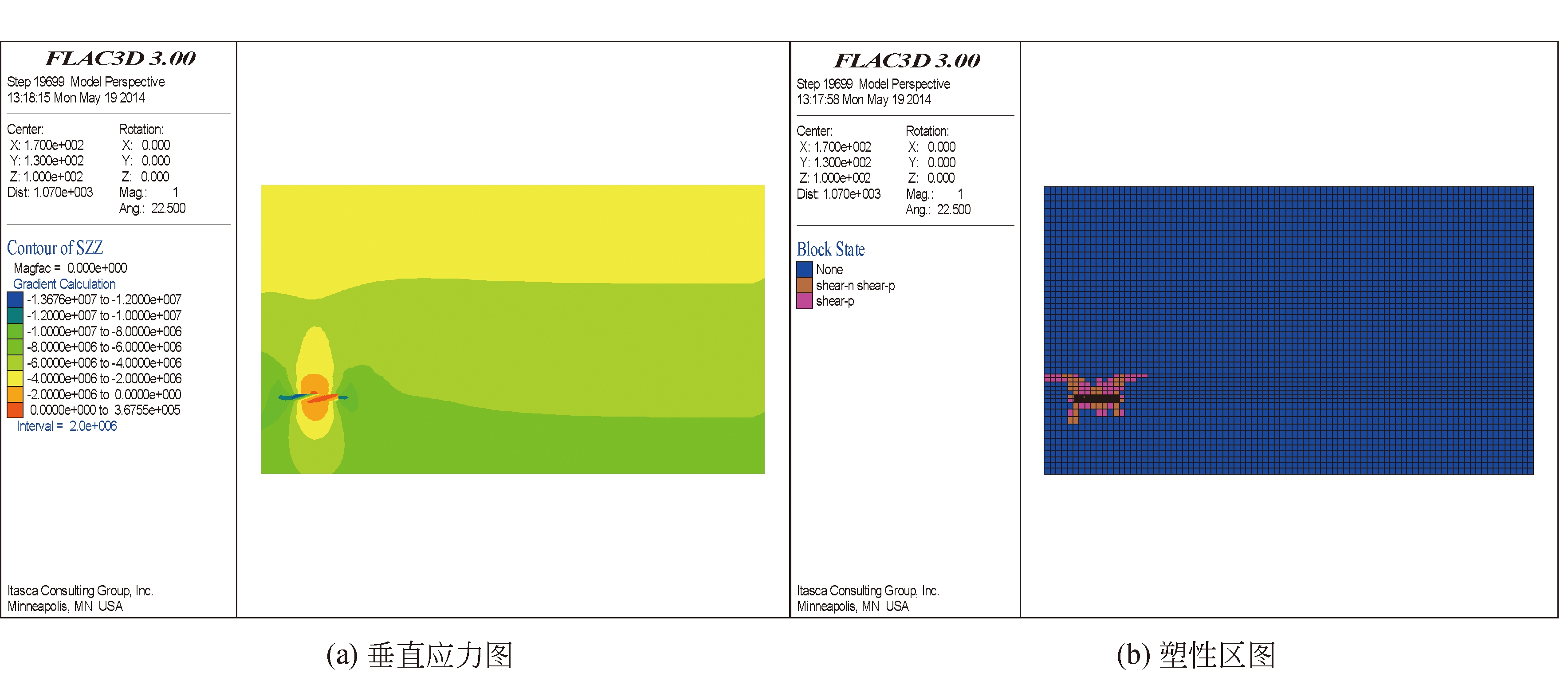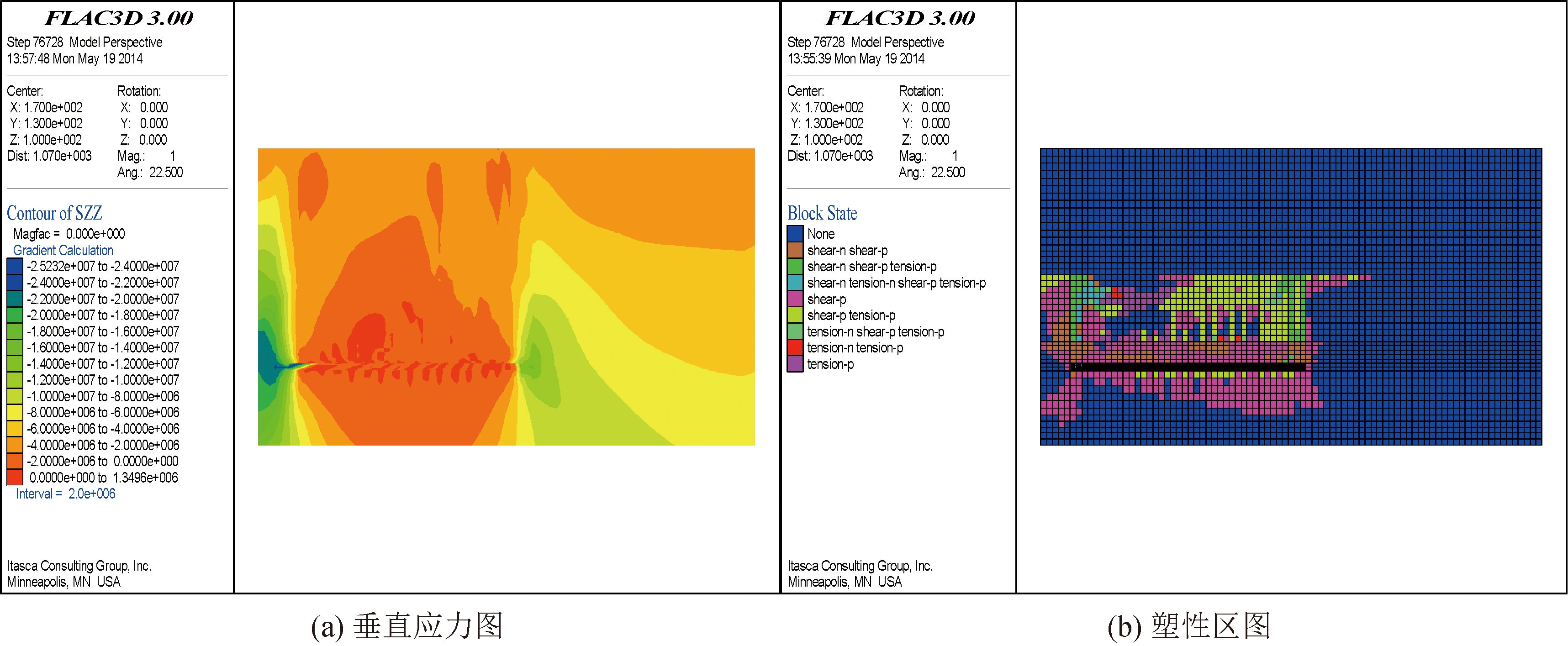 图4 开挖30 m时覆岩运动垂向应力图和塑性区图