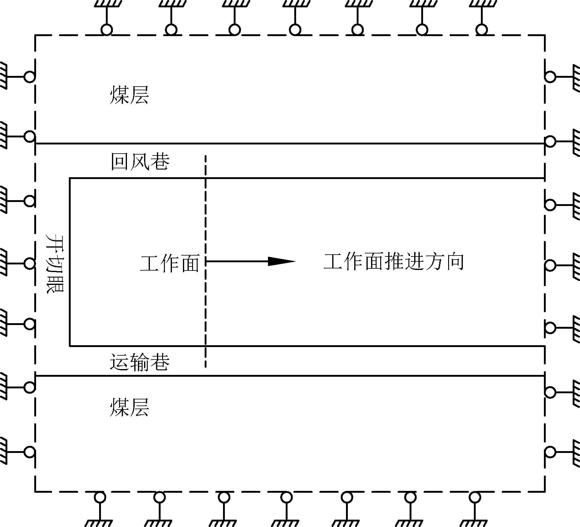 岩性密度ρ/kg∙m-3体积模量K/GPa剪切模量G/GPa内聚力c/MPa内摩擦角/(°)抗拉强度Rt/MPa地层厚度/m砂土层20000.020.010.02250.1055.82粉砂质泥岩21071.230.860.70370.559.10中砂岩23232.411.452.50402.9718.92粉砂岩24146.015.132.00392.6324.52中砂岩20661.260.952.30391.2024.01粉砂岩24145.094.792.20393.1013.98II-3煤层13001.501.201.20400.655.00粉砂岩23835.854.292.10402.4028.01中砂岩22326.053.643.20413.3020.64