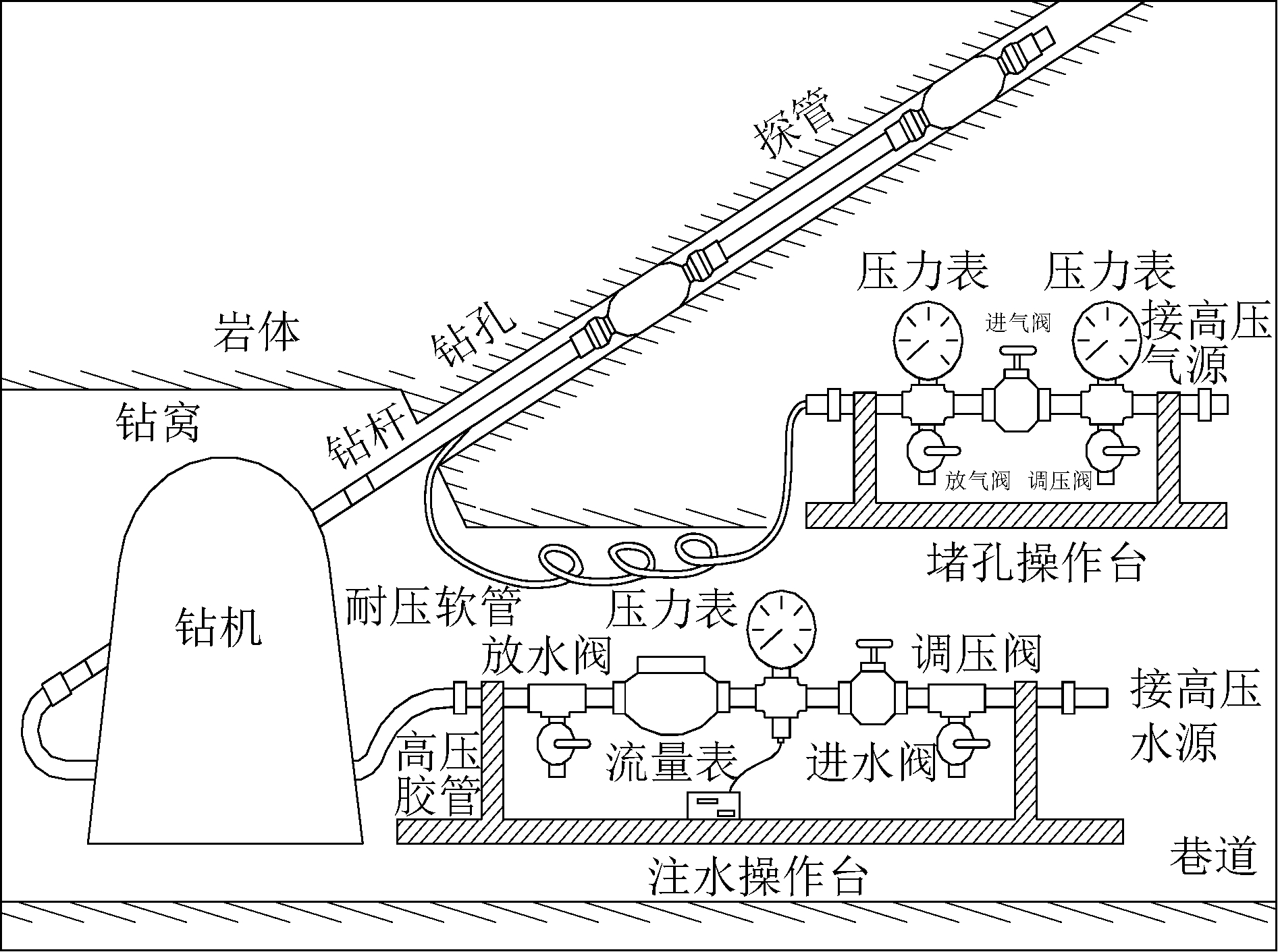 钻孔双端封堵测漏技术的观测系统如图7所示。现场实测过程中,选择合适的观测场所,在相邻工作面的运输(回风)巷或可测工作面停采线或开切眼以外的巷道中开掘钻窝(机房),向工作面上方打仰斜钻孔。在工作面回采前可以研究顶板岩层的原始裂隙发育规律,在工作面回采以后可以研究煤层顶板冒裂带高度。采用钻孔测漏法,沿钻孔进行分段封堵注水,测定钻孔各段的漏失流量,以此了解岩石的破坏松动情况,确定煤层顶板冒裂带高度。