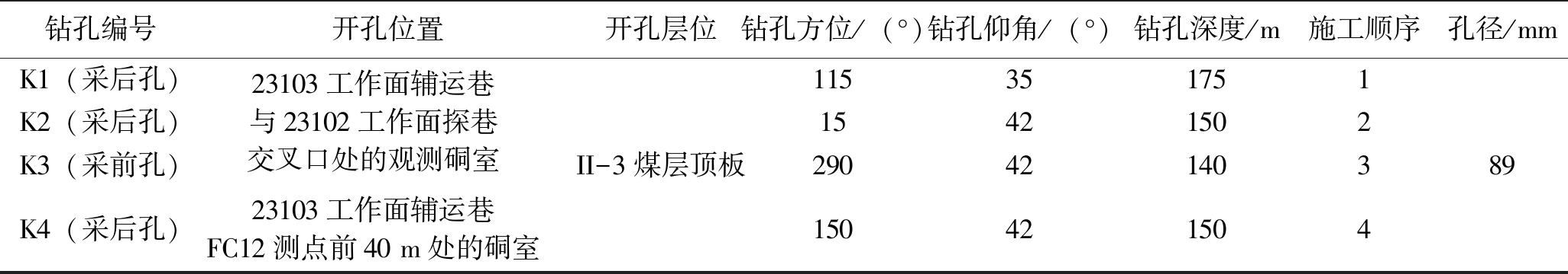钻孔编号开孔位置开孔层位钻孔方位/(°)钻孔仰角/(°)钻孔深度/m施工顺序孔径/mmK1(采后孔)K2(采后孔)K3(采前孔)K4(采后孔)23103工作面辅运巷与23102工作面探巷交叉口处的观测硐室23103工作面辅运巷FC12测点前40 m处的硐室II-3煤层顶板1153517511542150229042140315042150489