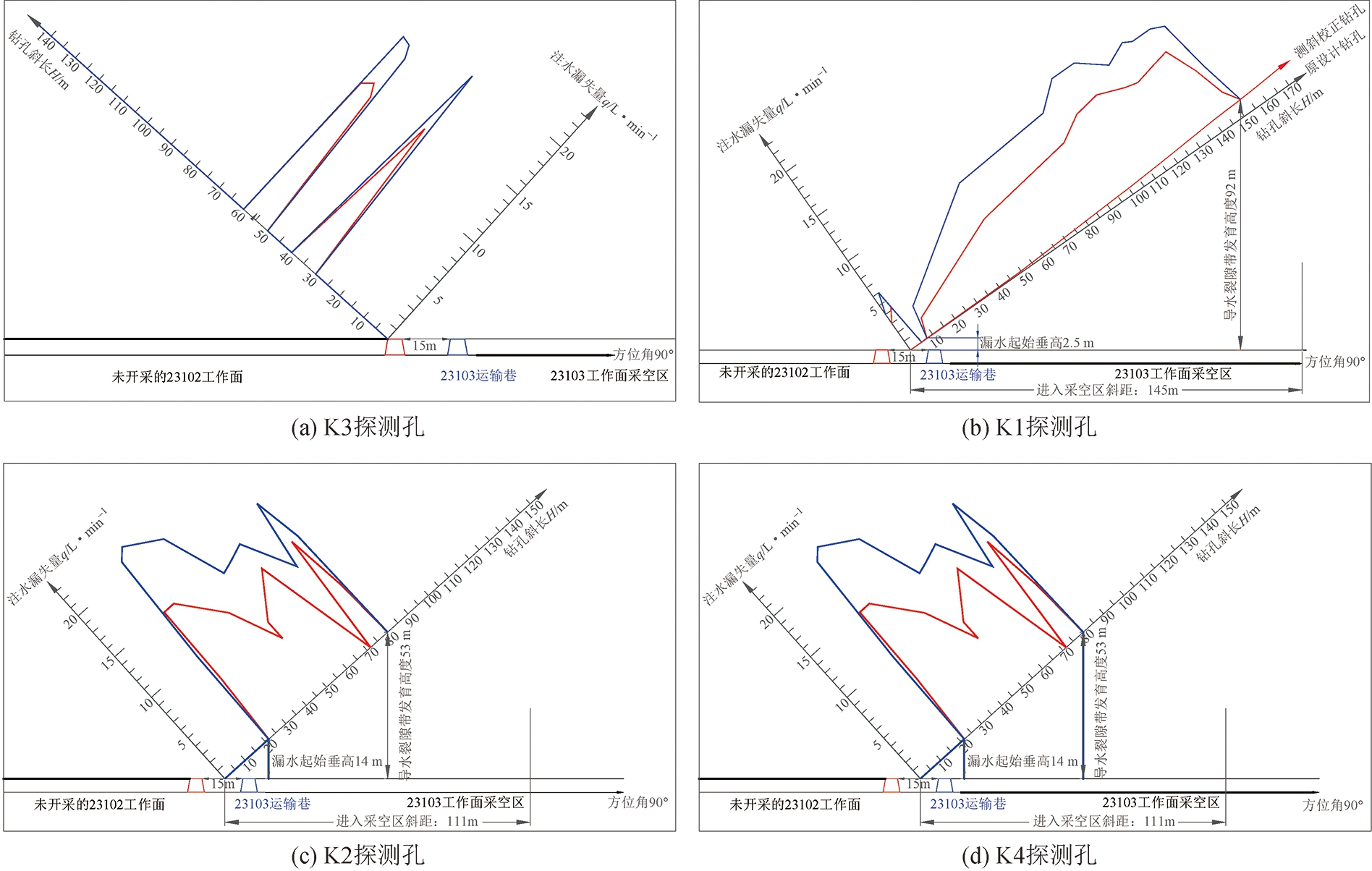 (3)采后观测孔的仰角需根据工作面斜长与导水裂缝带高度综合确定,同时应有两组不同仰角的观测孔进行对比;