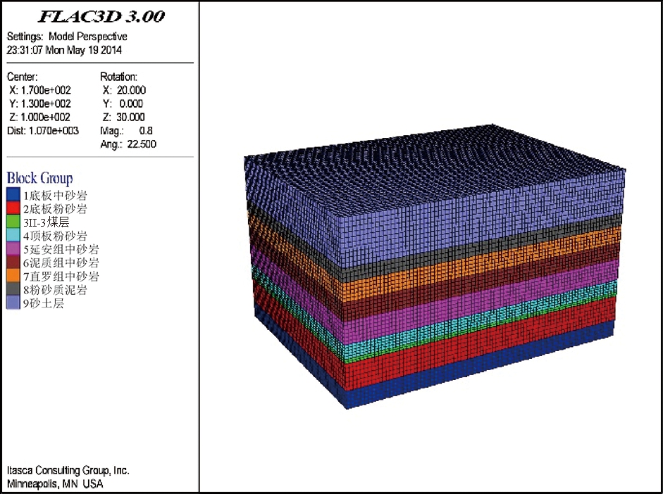 目前,数值模拟、模型试验和现场实测是研究开采煤层覆岩运动规律的主要手段,其中FLAC数值模拟软件是分析覆岩破坏、导水裂缝带发展过程的主要数值方法之一。运用该方法开展此类研究时,众多研究人员将塑性区范围的演化视为顶板导水裂缝带的发育过程,获得了较多的研究成果。本文利用FLAC3D有限差分软件进行建模,研究薄基岩浅埋深煤层开采覆岩运移特征,特别是采动覆岩破坏形成的导水裂缝带发育形态、高度。结合工作面条件及首采面区域的岩层结构特征,对岩性和力学参数相近的岩层进行简化合并,建立数值模型长400 m、宽400 m、高200 m,设计一次采全高5 m,三维模型共划分259675个单元、272448个节点,参照研究区内岩石力学测试资料确定模拟所需的力学参数,见表1。