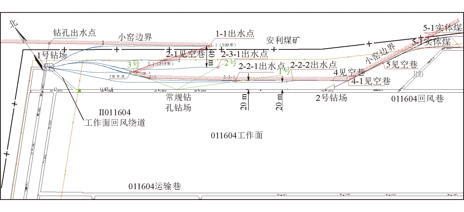 探查表明,011604回风巷开口位置施工的12个钻孔中的11个钻孔揭露了小煤窑巷道,4个钻孔出水,判断安利煤矿16号煤层越界深度为54 m,长度为445 m,疏放老空水2.35万m3;在011604回风巷250 m钻场施工的3个钻孔均揭露小煤窑巷道无水。根据探查结果,工作面前670 m范围011604回风巷位置已由原来位置向井田内回退50 m,670~1 470 m范围调整了011604回风巷位置,向井田边界偏移75 m,释放了48万t资源储量,目前工作面已安全回采。011604工作面同层小煤窑探查钻孔示意如图3所示。