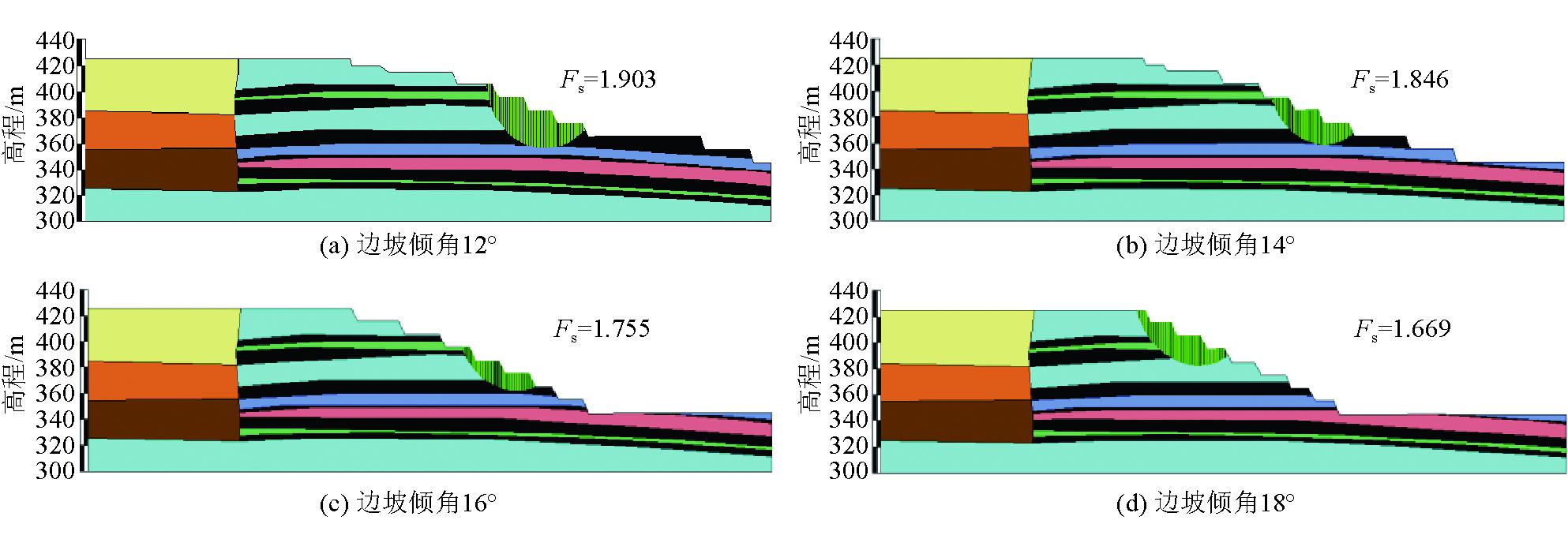 不同倾角工况下边坡稳定性计算结果如图11所示。边倾角为12°、14°、16°、18°时,随边坡倾角增加,边坡安全系数Fs逐渐减小,分别为1.752、1.650、1.542、1.432。