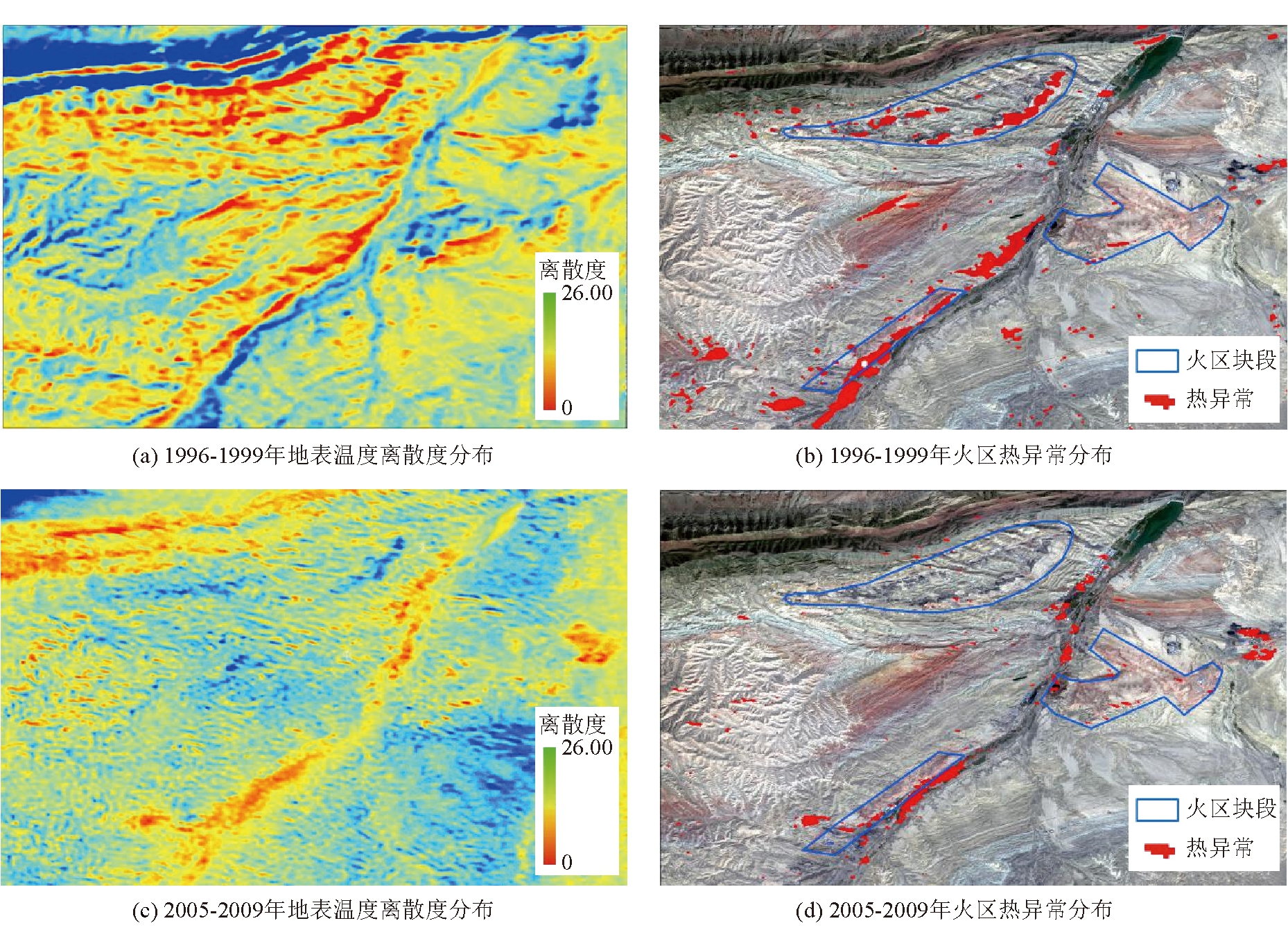 (1)万家窑火区块段煤矿均为地下开采,受北东向深大断裂控制,火区与之平行。1996-1999年,该区热异常面积为5.38 万m2;2000-2004年,新疆煤田灭火工程局开始重点对1号、2号燃烧点进行灭火工程治理,2005-2009年,热异常面积减少至1.36万m2 ;2014-2018年,由于违规开采,煤火复燃并向南部扩张,面积扩大至14.53 万m2,如图2(f)所示;2019年,经过地质环境治理和生态修复,该区热异常范围大幅减少,面积缩小至0.96 万m2。