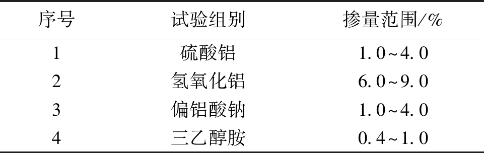 序号试验组别掺量范围/%1硫酸铝1.0^4.02氢氧化铝6.0^9.03偏铝酸钠1.0^4.04三乙醇胺0.4^1.0