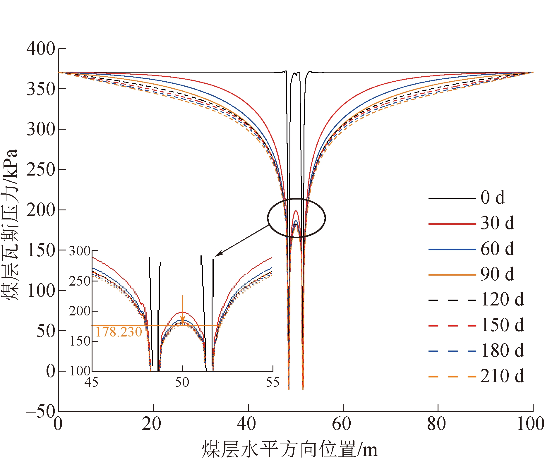 布孔间距为3.0 m时,煤层瓦斯压力分布如图3所示。由图3发现,距离钻孔越近,瓦斯压力越低,随着距钻孔距离的增加,瓦斯压力逐渐增加并趋近于原始瓦斯压力;距钻孔位置较近煤体的瓦斯压力下降较快,同一位置处瓦斯压力随着抽采时间的延长而降低;经过不同的抽采时间,煤层瓦斯压力降低的范围不同,从0 d到30 d再到90 d最后达到210 d,钻孔周围煤体瓦斯被不断抽出,煤层瓦斯压力逐渐降低,产生瓦斯压力降低的范围越来越广,抽采影响区域范围逐渐增大。