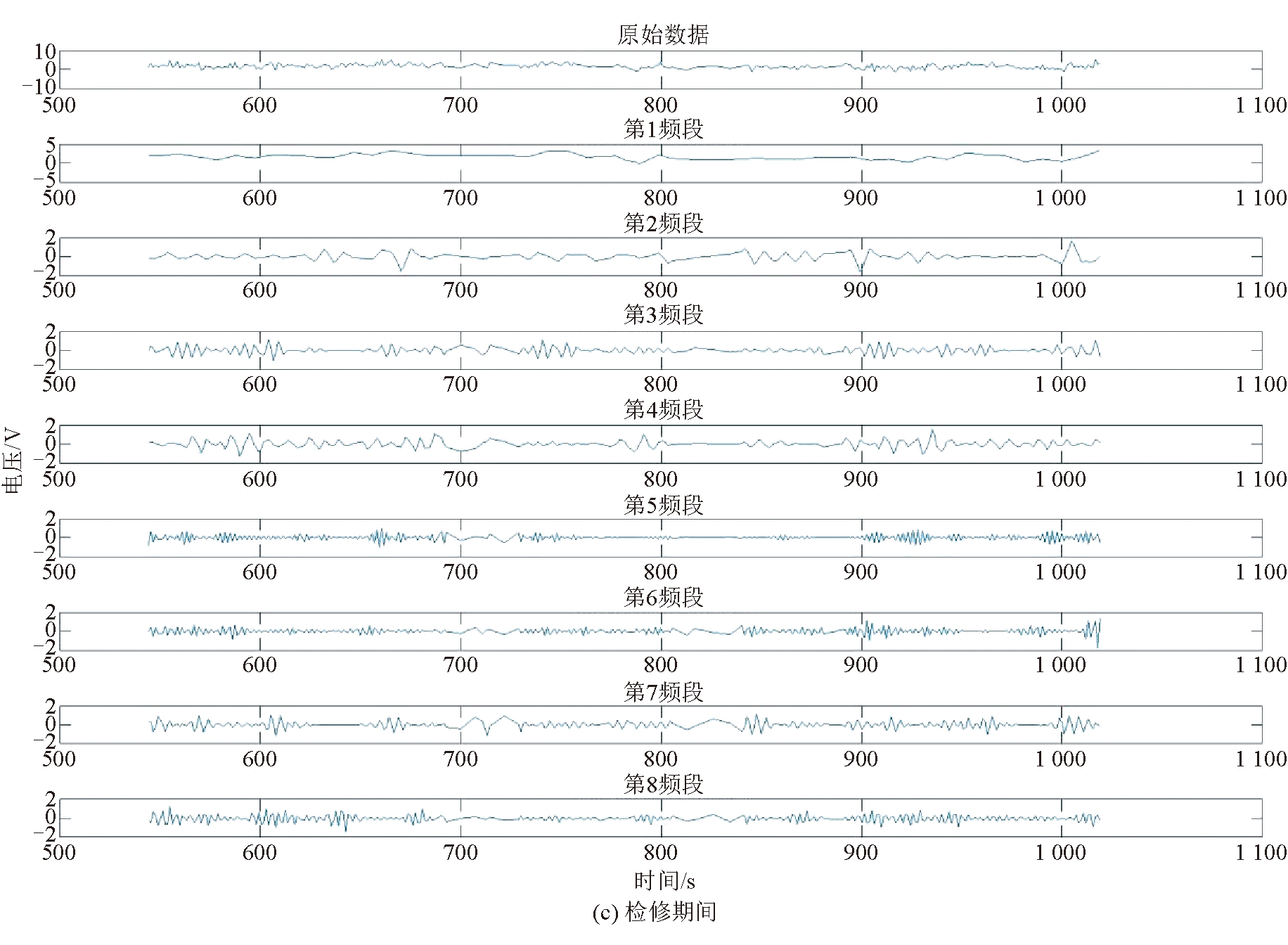 根据上述小波包能量谱特征提取方法,得到综采工作面在交接班、割煤、检修期间CO浓度时间序列小波包分解频带波形和8个频带内的特征能量谱,分别如图4和图5所示。