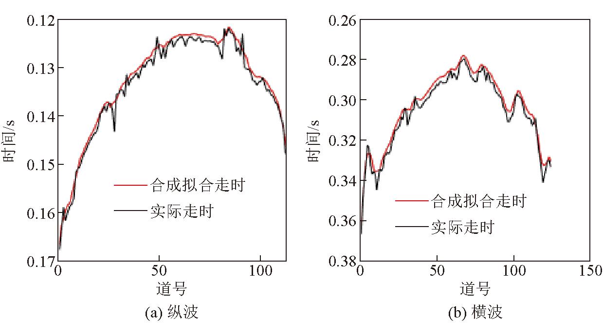 受透射法探测距离所限,工作面实际观测系统沿x方向分为两段0~350 m和320~1 000 m进行布设,分别建立x=350 m,y=451 m,z=28 m和x=680 m,y=451 m,z=28 m的3层模型,在深度(z)10~13 m处设置煤层,大体检波器布置到煤层中间层位,道间距为5 m,炮间距为10 m,有效炮共有192炮。按照表2为走时反演赋初值建立三层模型,利用高斯平滑将三层模型光滑,提升射线追踪效果。拾取每一炮的走时信息,如图7中粉色和蓝色走时曲线标定处,则所有走时拾取点如图9所示。将拾取横纵波的走时分别求解程函方程的反演计算系统中,纵波初至经过迭代100次,横波初至经过迭代50次,走时拟合剩余残差均方差曲线如图10所示,第15炮的合成走时和实际走时拟合情况如图11所示,得到最佳速度模型,如图12所示。