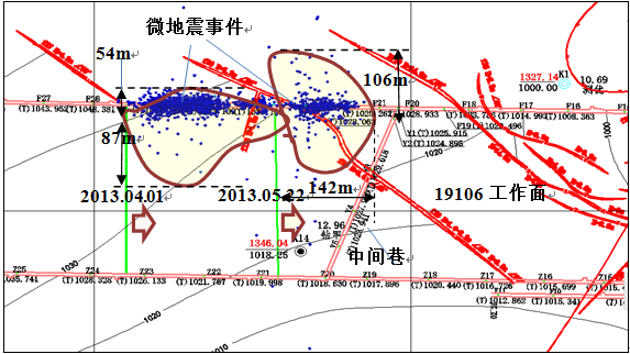 震监测的岩层破裂平面投影图如图5.3所示。通过监测获得了工作面120米长度条件下的顶板、底板破裂的结果以及开采对断层、陷落柱的活化影响距离、影响程度等参数,为预警突水提供了依据。