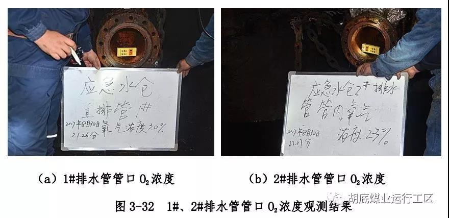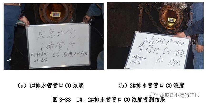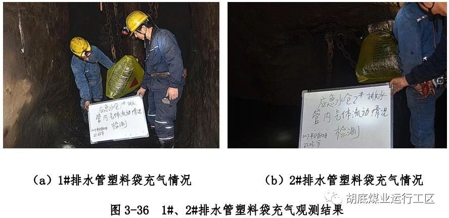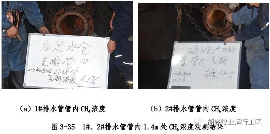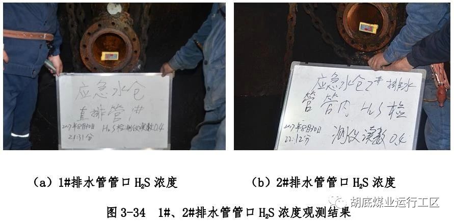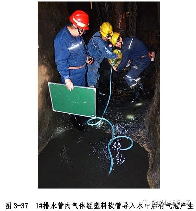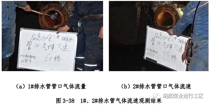 主斜井底右侧下方偏下位置排水管编号为 2#排水管)管口处 O2、CO、H2S 浓度进行测试,各测点浓度测试结果如图 3-32~3-34所示;然后使用长度约 1.4m 探杆绑上橡胶软管,对 2 根排水管内 1.4m 深处 CH4 浓度进行测试,测试结果如图 3-35 所示;用塑料袋封堵直排管孔口,观测塑料袋充气情况,如图 3-36 所示;用塑料软管一端插入 1#排水管管口充气塑料袋内,一端插入水中,观测有气泡产生,结果如图 3-37 所示。2 根排水管内气体成分及浓度测试结果汇总如表 3-2 所示。使用风表对 2 根排水管气体流量进行测试,风表均以较快速度转动,测试结果如图3-38 所示。以上测试结果表明:在井下负压状态下,2 根直排井排水管内均有 CH4、CO、H2S 等有毒有害气体涌出,排水管内O2浓度极低。
