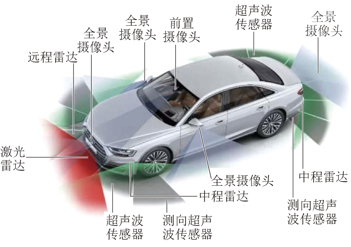 当前的自动驾驶汽车技术已经成熟,车上搭载了4个全景摄像头、1个前置摄像头(测距5~100 m)、12个超声波雷达(测距3~5 m)、1个毫米波远程雷达(测距大于200 m)、4个毫米波中程雷达(测距100~200 m)、1个激光雷达等多种环境感知传感器,如图19所示。这种多信息融合架构形成了全方面、立体化的自动驾驶环境感知系统,是智能采煤机环境感知能力提升可借鉴的模式。