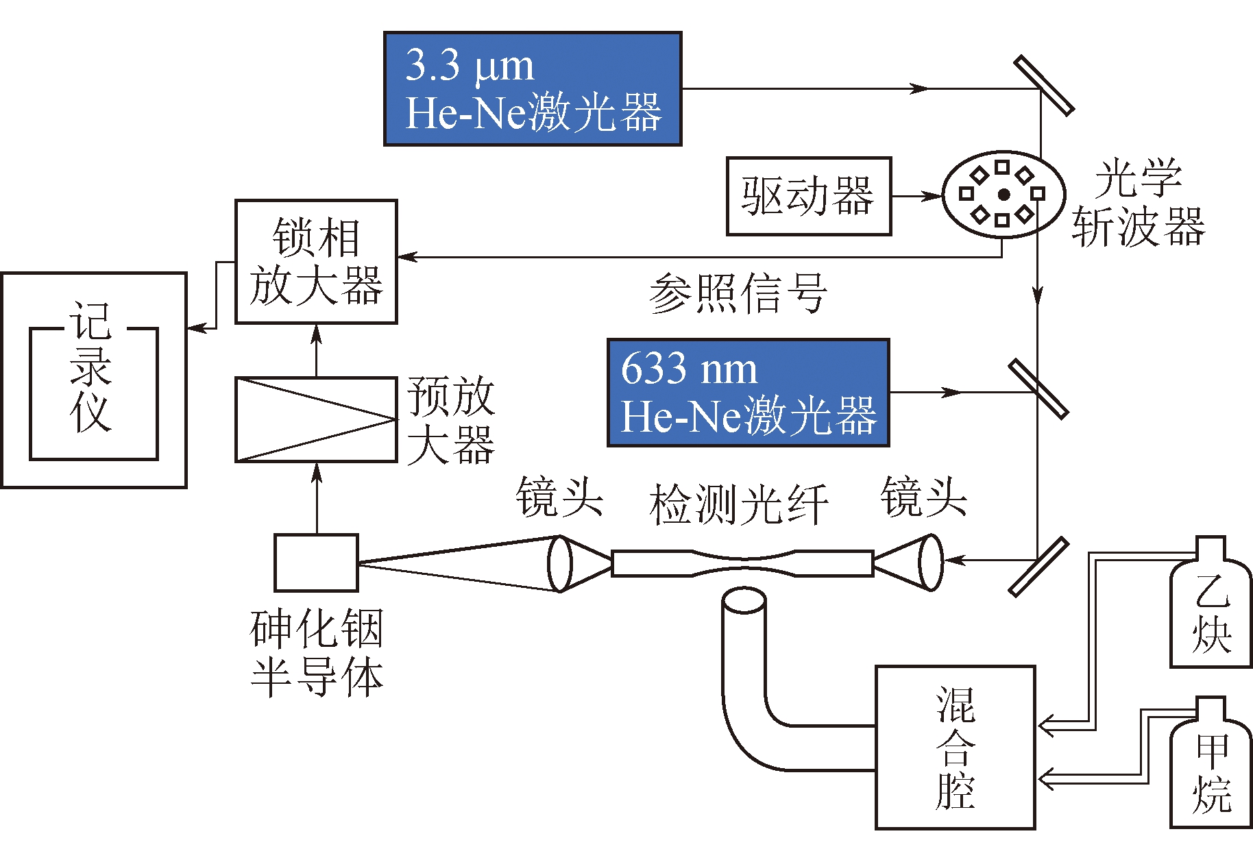 1979年,日本东北大学的稻叶文男(INABA H)和陈建裴(CHAN K)等提出了利用长距离光纤进行大气污染检测技术思路,1981年他们用LED光源进行了甲烷气体浓度检测试验,1983年又用1.66 μm波长的InGaAsP发光二极管和干涉滤光片组成光纤传感系统,对瓦斯吸收谱线进行检测,实现了25% LEL(气体爆炸下限)的高灵敏度探测[36]。1986年,美国石油天然气工程师学会设计了基于1.67 μm红外光源的双波长差分吸收型瓦斯监测报警器,分辨率达到3% LEL。1987年,泰英夫(TAI H)采用2个单模分布反馈式半导体激光器组成1个复合光源,以1个光纤系统同时检测甲烷和乙炔浓度,如图8所示。该系统对甲烷和乙炔的最低探测灵敏度分别为5.0 mg/L和3.0 mg/L[37]。1990年,山本(YAMAMOTO K)等利用1.66 μm单模分布反馈式半导体激光器,采用了波长(频率)调制谐波检测方法,室温下检测甲烷气体浓度的最低探测灵敏度为20 mg/L。
