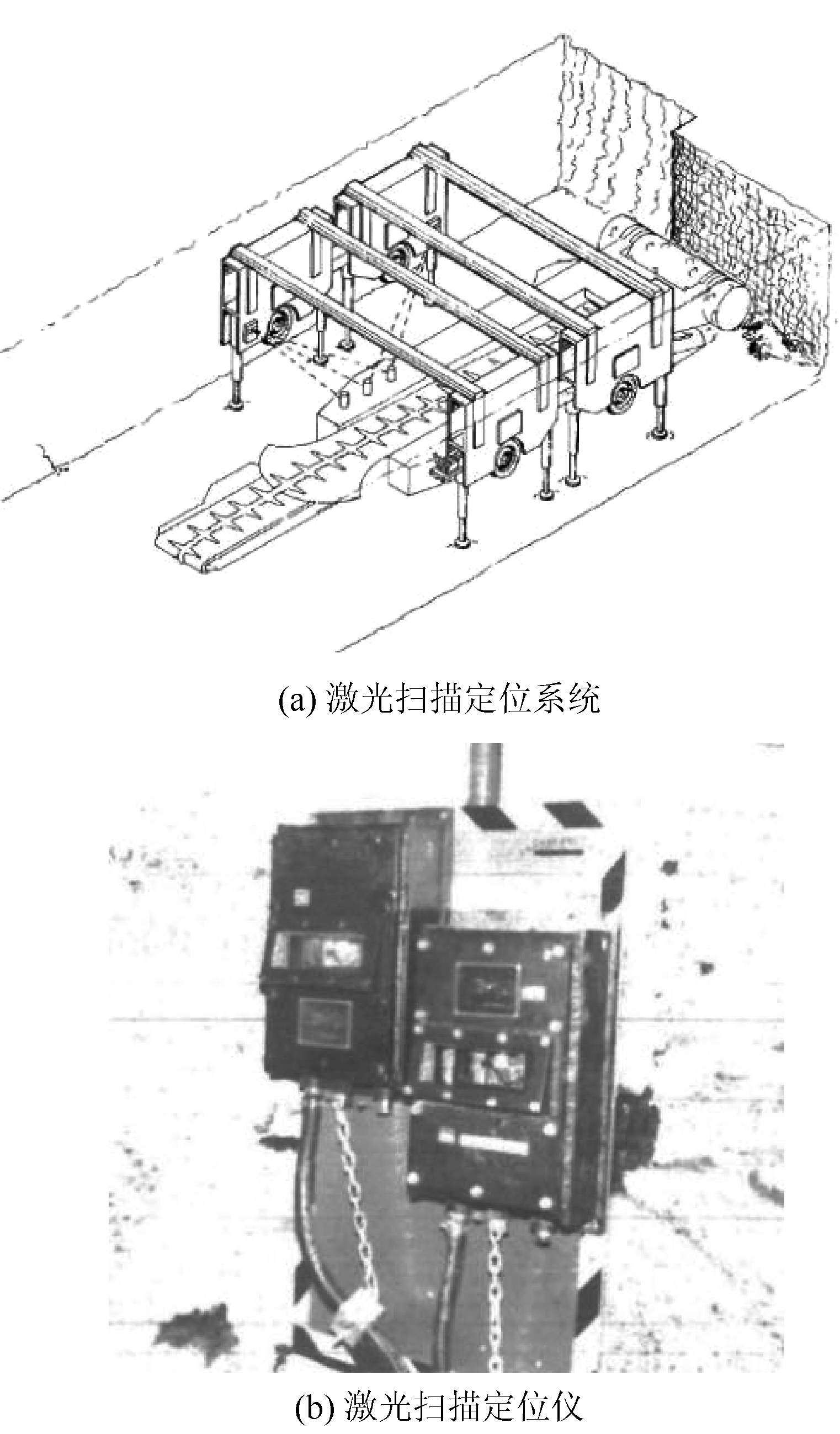 20世纪90年代,美国矿山局(USBM)推动了计算机辅助采煤系统研究,目的是把工人撤出工作面,进行远程控制采煤过程。20世纪80年代末,美国矿山局匹兹堡研究中心研发出基于激光扫描的连续采煤机导航和定位系统,设计了1个移动导控架(Mobile Control Structure,MCS)作为作业区的定位基准,连续采煤机行驶在车架下面,以车架位置作为定位和导向基准点,如图12所示。该系统的有效测距为11 m,航向角精度为±0.25°,位置精度为65 mm,在环境粉尘浓度13 mg/m3下仍能稳定工作[70]。