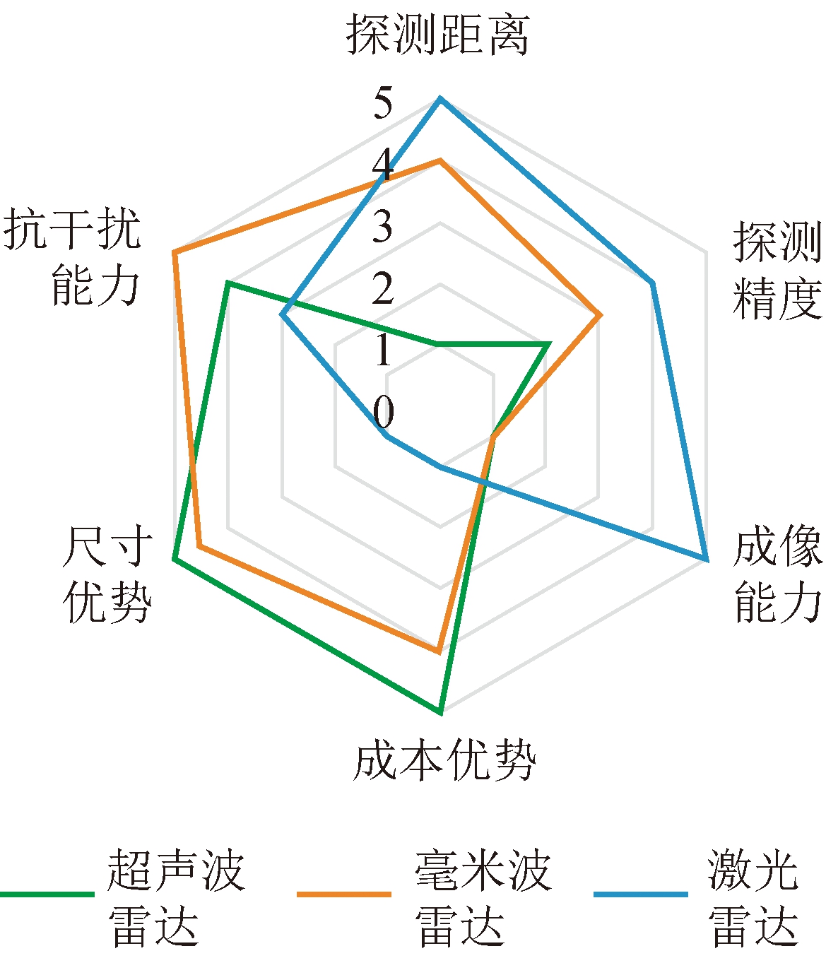 超声波雷达、毫米波雷达、激光雷达在探测距离、探测精度、成像能力、成本优势、尺寸优势、抗干扰能力方面的对比如图6所示。