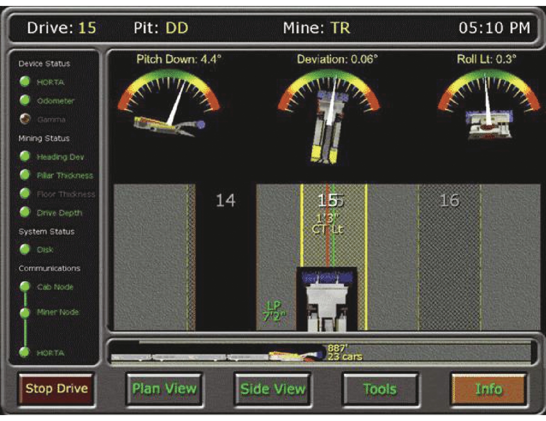 20世纪90年代中期, 澳大利亚联邦科学与工业研究院里德(REID D C)等[74]探索了惯导技术在地下采矿定位和自动化的应用,1996年他将惯导技术应用于房柱开采连续采煤机,提出了基于惯导航向信息与外部传感器航距信息相结合的高精度定位模式。同年,他创办了采矿应用技术(Applied Mining Technologies)公司,开发出MK3房柱开采导航系统,能够监测显示连采机的推进深度、航向角、偏航角、煤层厚度及机器俯仰角和横滚角等信息,如图15所示。