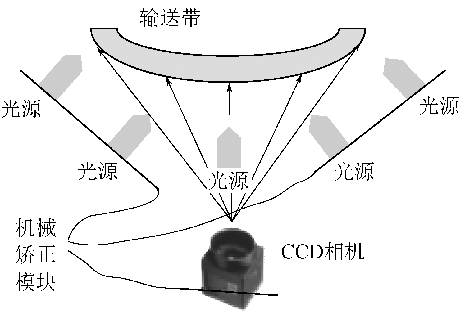 2010年之后,机器视觉技术才在采掘机械上开始应用。2013年,田原[23]研究了基于机器视觉技术的掘进机机身空间位姿自动检测技术,采用机器视觉技术检测摄像机与激光指向仪之间的相对空间位姿,通过空间矩阵变换计算出掘进机机身相对指向激光的空间位姿参数,试验结果表明该系统的平移量检测偏差为3.5 mm,航向角检测偏差为0.5°,俯仰角和横滚角检测偏差为0.1°;2017年,石晟等[24]设计了矿用钢丝绳的机器视觉无损监测系统,机器视觉图像采集设备安装在现场钢丝绳运转位置,采集钢丝绳图像并传输到中控主机进行图像识别、人工智能判别及报警信号发出,可对钢丝绳的断丝、磨损、锈蚀等损伤缺陷进行在线监测;2019年,张旭辉等[25]设计了1种基于视觉测量的液压支架位姿检测方法,在采煤机上安装防爆相机,对在液压支架上的红外LED标识板进行图像采集,基于4个共面特征点的视觉算法得出液压支架底座位姿,该方法检测液压支架的位姿精度小于0.7°,直线度精度小于20 mm;2020年,顼熙亮[26]报道了矿用带式输送机故障的机器视觉智能检测系统,在大同同忻煤矿使用,该系统采用5个线性光源的单台线阵CCD相机捕捉输送带表面图像,如图7所示。智能监控报警模块接收输送带监测图像,通过识别模块对撕裂、跑偏等故障危险等级进行评估,并根据危险程度采取报警、停机等措施。