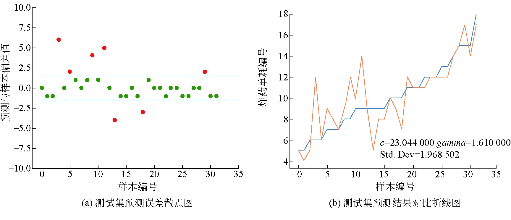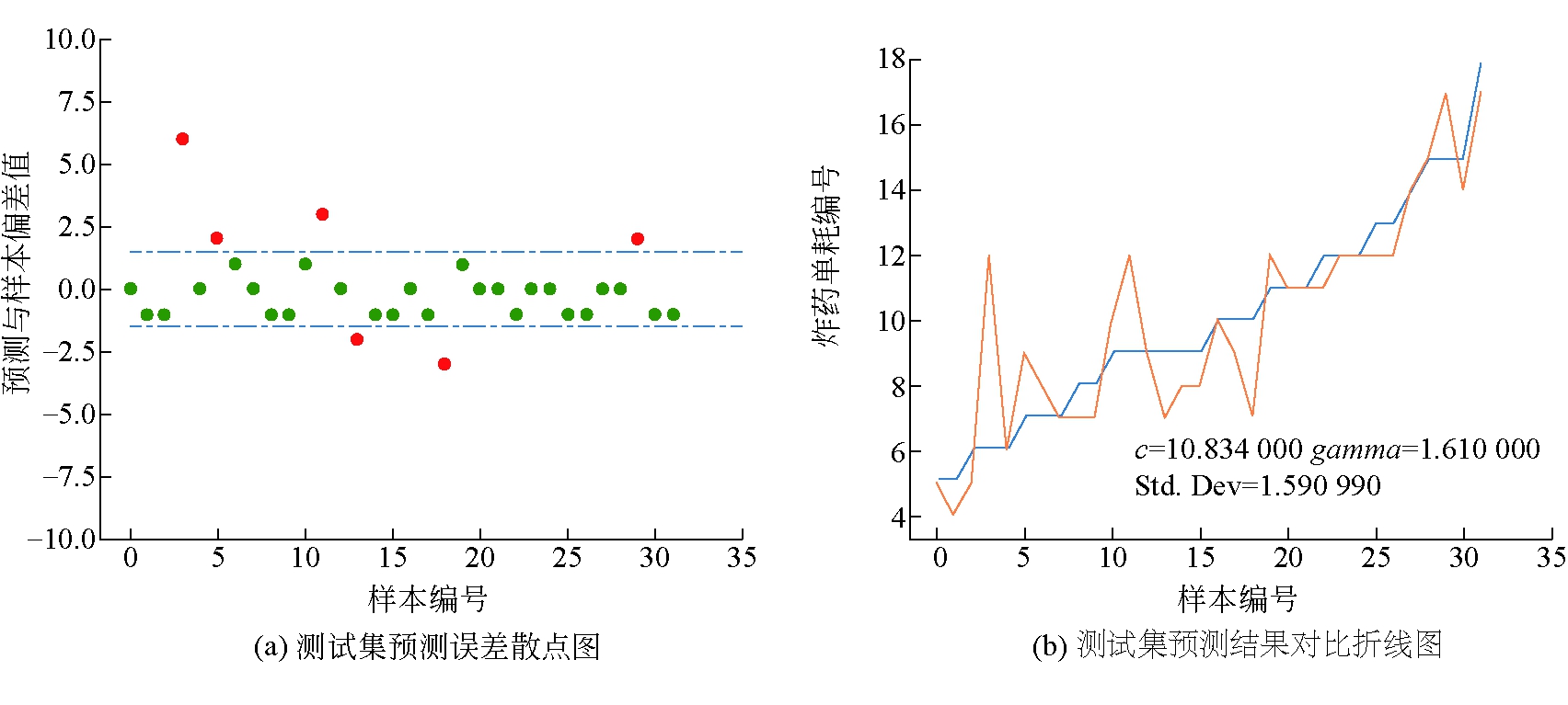 图2 各变量重要性排序 根据图2给出的变量重要性,选取导致误差增大10%以上的变量作为模型的最终输入变量。最终选取的输入变量为:巷道净宽、巷道净高、普氏系数、炮眼深度、全断面炮眼数、掏槽方式,以爆破炸药单耗作为输出参数。 3.3 建立基于SVM的爆破炸药单耗预测模型模型采用Python作为编程语言,并调取Scikit-Learn库作为SVM的运行基础,选取高斯核函数进行预测,使用网络搜索和SSA对超参数进行调优。以通过误差分析法确定的6个指标作为模型输入参数,爆破炸药单耗作为输出参数,分别带入经过SSA优化算法和网格搜索得到的超参数c和gamma,建立起基于SVM的煤矿巷道爆破参数预测优化模型。然后使用训练集对模型进行训练,最后将测试集输入模型中对模型预测性能进行检验。 3.4 SVM模型预测结果对比基于两种不同的算法对参数进行优化得出参数后对训练集进行测试,原数据集共128组,按照3∶1的比率分为测试机和训练集。两种参数优化方法在测试集上得到的预测结果如图3、图4所示。不同算法预测结果对比见表3。由表3可知,两种方法找到的最优参数c和gamma有着较大的区别,但最终在训练集上的预测效果只相差1个百分点,在测试集上SSA优化算法比网格搜索预测效果更好。 表3 不同算法预测结果对比