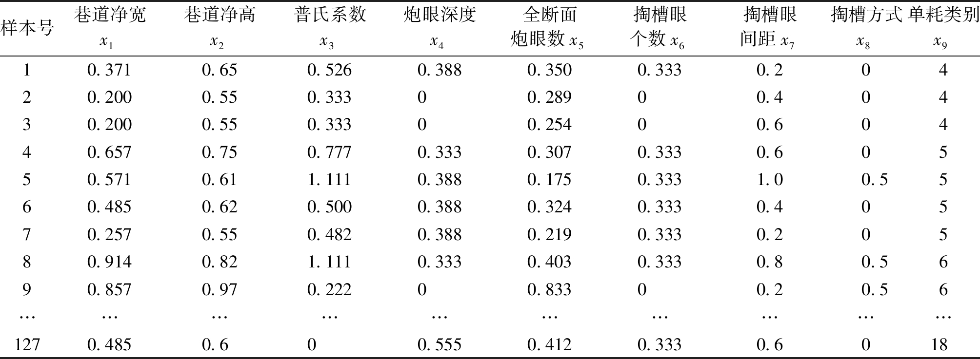 样本号巷道净宽x1/m巷道净高x2/m普氏系数x3炮眼深度x4/m全断面炮眼数x5/个掏槽眼个数x6/个掏槽眼间距x7/mm掏槽方式x8炸药单耗x9/(kg·m-3)13.73.0552.0506500楔形掏槽1.8024.33.3551.34410450楔形掏槽1.7434.02.4081.8426400楔形掏槽1.8844.23.0052.3636500楔形掏槽2.5156.05.1072.81346400直眼掏槽1.4763.72.4092.0428450楔形掏槽1.7373.82.6061.8448450楔形掏槽1.7484.03.2081.7886450复合掏槽0.7093.02.8052.3566500楔形掏槽3.00…………………………1274.83.305.02.0956500楔形掏槽3.07 表2 煤矿爆破数据经整理及归一化后数据集