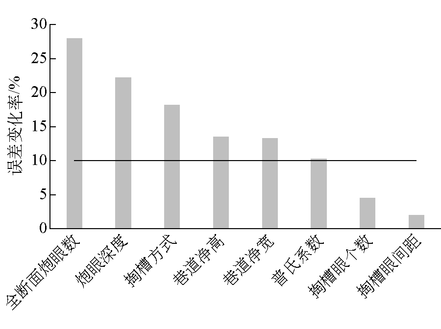 样本号巷道净宽x1巷道净高x2普氏系数x3炮眼深度x4全断面炮眼数x5掏槽眼个数x6掏槽眼间距x7掏槽方式x8单耗类别x910.3710.650.5260.3880.3500.3330.20420.2000.550.33300.28900.40430.2000.550.33300.25400.60440.6570.750.7770.3330.3070.3330.60550.5710.611.1110.3880.1750.3331.00.5560.4850.620.5000.3880.3240.3330.40570.2570.550.4820.3880.2190.3330.20580.9140.821.1110.3330.4030.3330.80.5690.8570.970.22200.83300.20.56…………………………1270.4850.600.5550.4120.3330.6018 3.2 影响爆破炸药单耗重要因素选取影响爆破炸药单耗因素有很多,如巷道高、巷道宽、岩石普氏系数、炮眼深度、炮眼数、掏槽方式等。输入模型的影响因素并非越多越好,部分参数与目标变量相关性弱,或变化率过大,对于预测来说不仅会使数据加入过多的噪点,影响其学习精度,还会导致模型复杂化,造成模型过拟合。选取合适的输入参数能在简化模型的基础上提高预测准确率。随机森林算法里的误差分析法可以很好地解决参数难以选择的问题,误差分析法通过对每一个预测变量随机赋值,如果该预测变量更为重要,那么其值被随机替换后模型预测的误差会增大,该值越大表示该变量的重要性越大,使用误差分析法得到的炸药单耗影响变量的重要性排序,如图2所示。