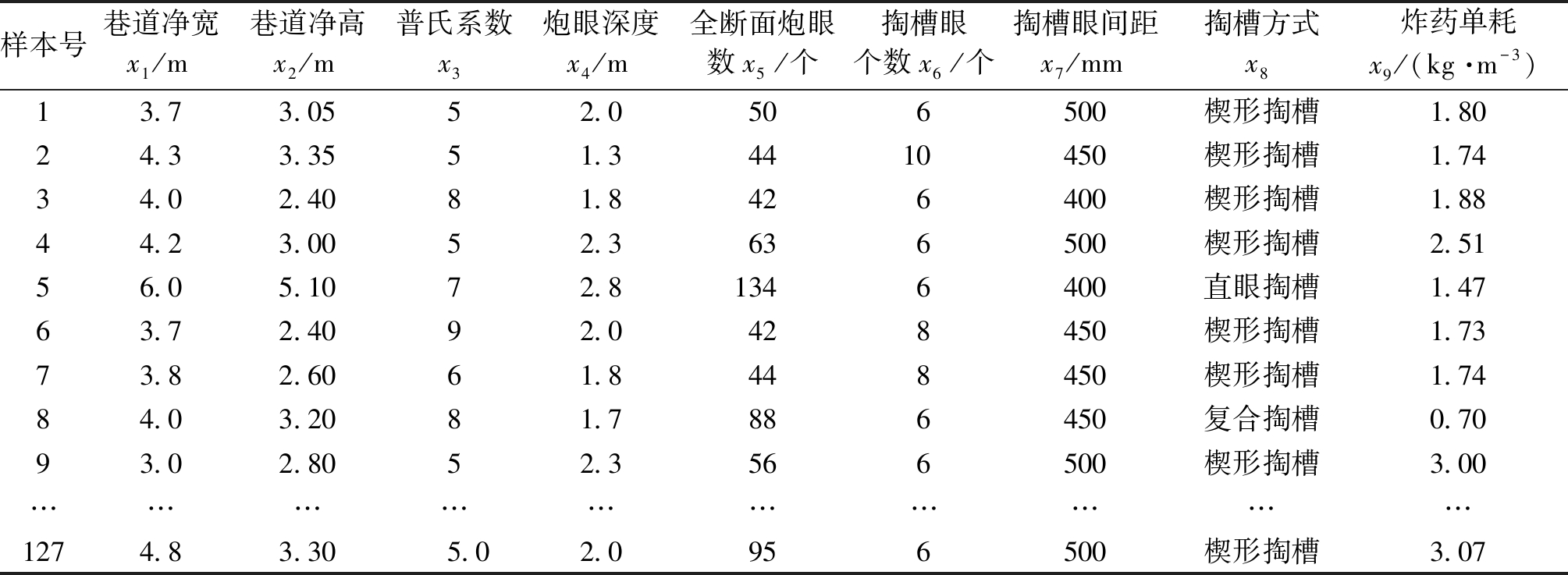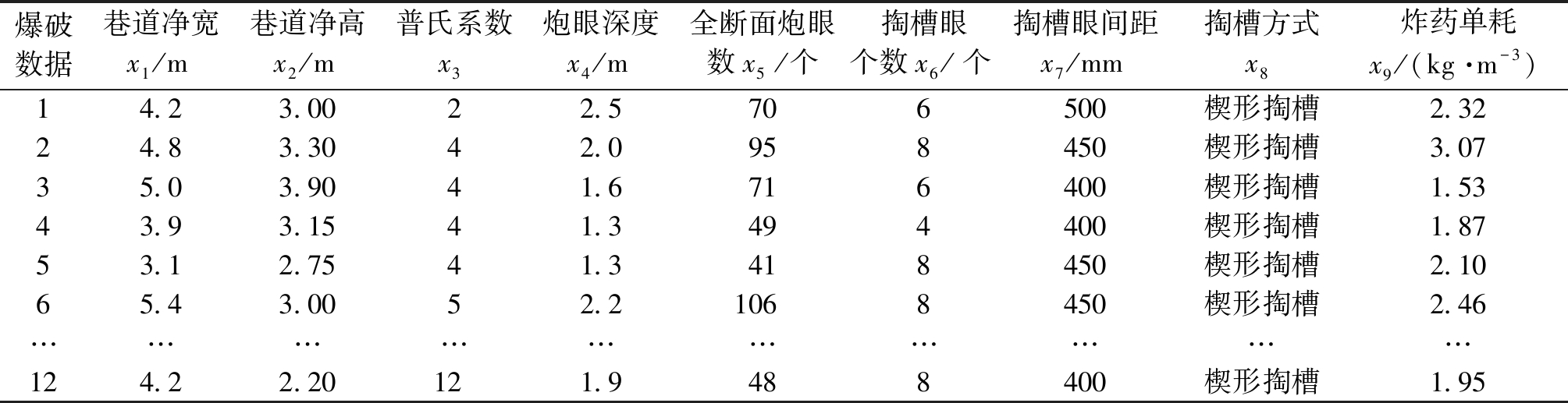 爆破数据巷道净宽x1/m巷道净高x2/m普氏系数x3炮眼深度x4/m全断面炮眼数x5/个掏槽眼个数x6/个掏槽眼间距x7/mm掏槽方式x8炸药单耗x9/(kg·m-3)14.23.0022.5706500楔形掏槽2.3224.83.3042.0958450楔形掏槽3.0735.03.9041.6716400楔形掏槽1.5343.93.1541.3494400楔形掏槽1.8753.12.7541.3418450楔形掏槽2.1065.43.0052.21068450楔形掏槽2.46…………………………124.22.20121.9488400楔形掏槽1.95